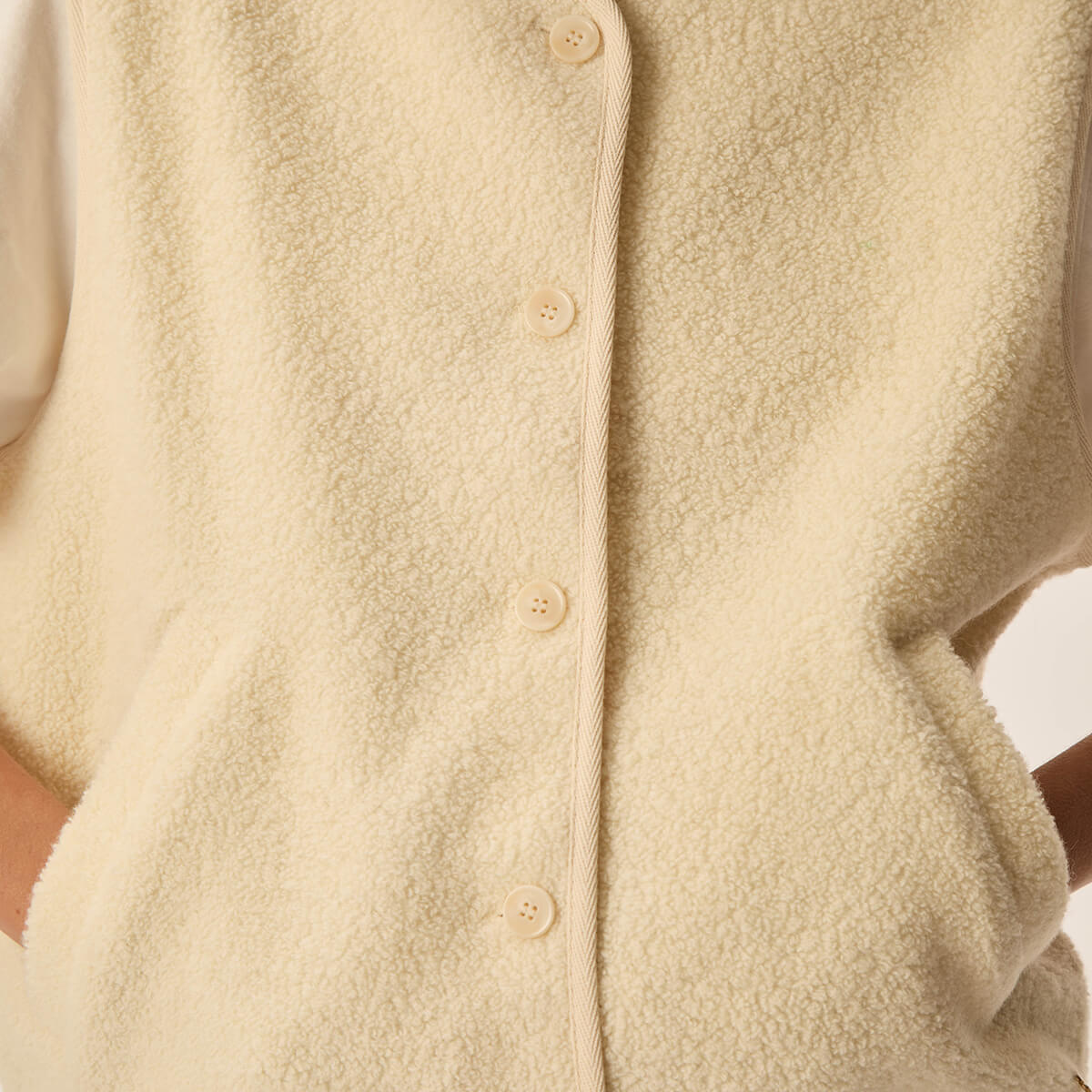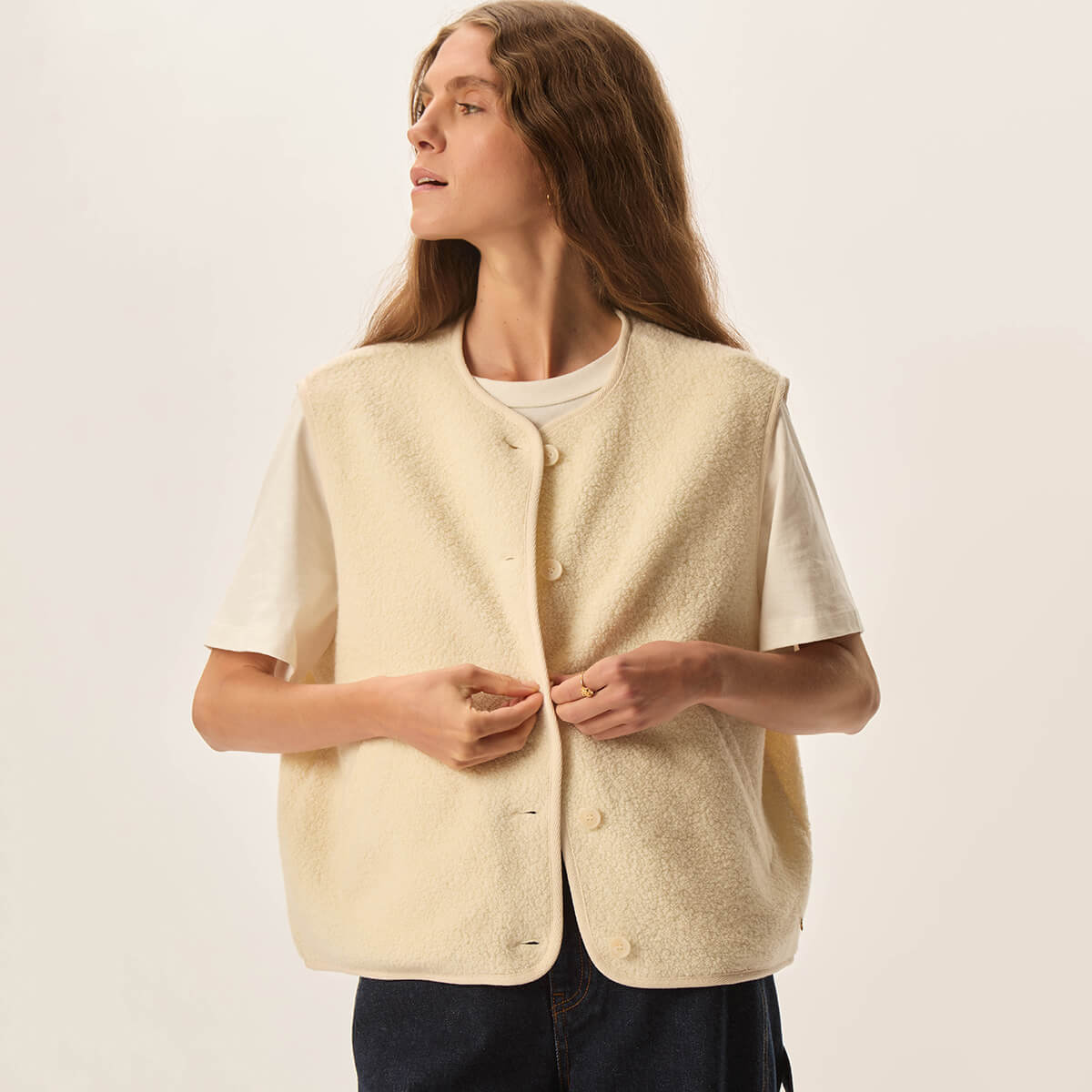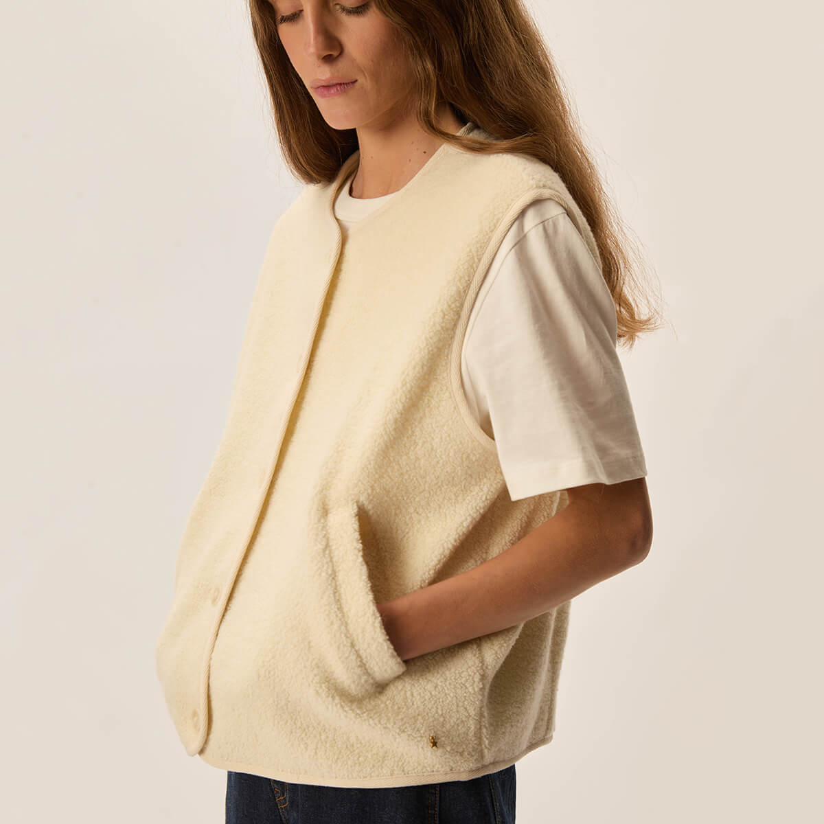 Zlata Vest by Des Petits Hauts. A feminine cut with a bias and tone-on-tone buttoning, the Zlata sleeveless jacket in bouclé wool has become a must-have. Minimalist and easy to pair with a blouse or a sailor top, you will immediately adopt its bouclé look.
