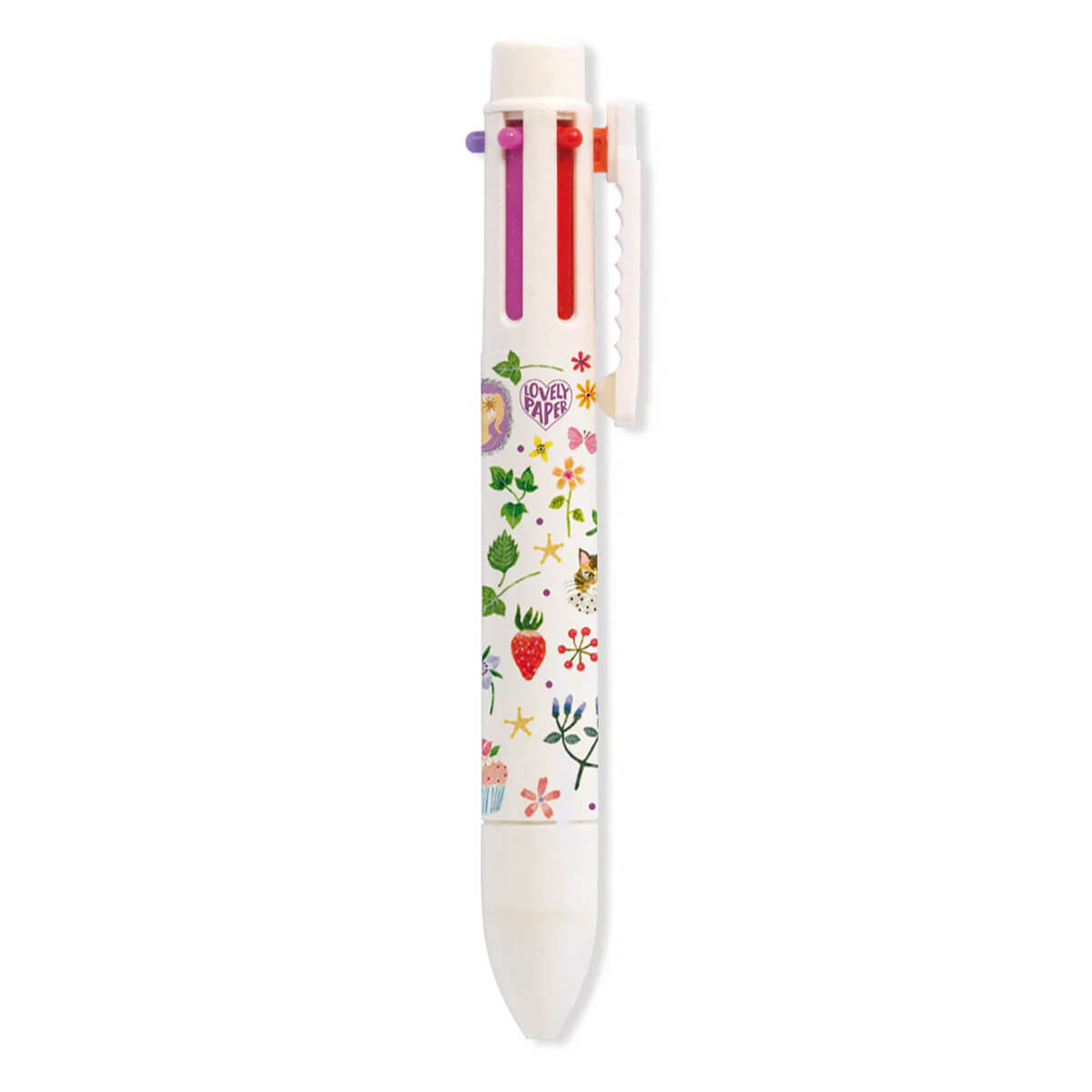 Lucille rainbow pen by Djeco. A lovely pen featuring pretty illustrations and 6 different ink colours: Red, pink, purple, blue, green and orange.