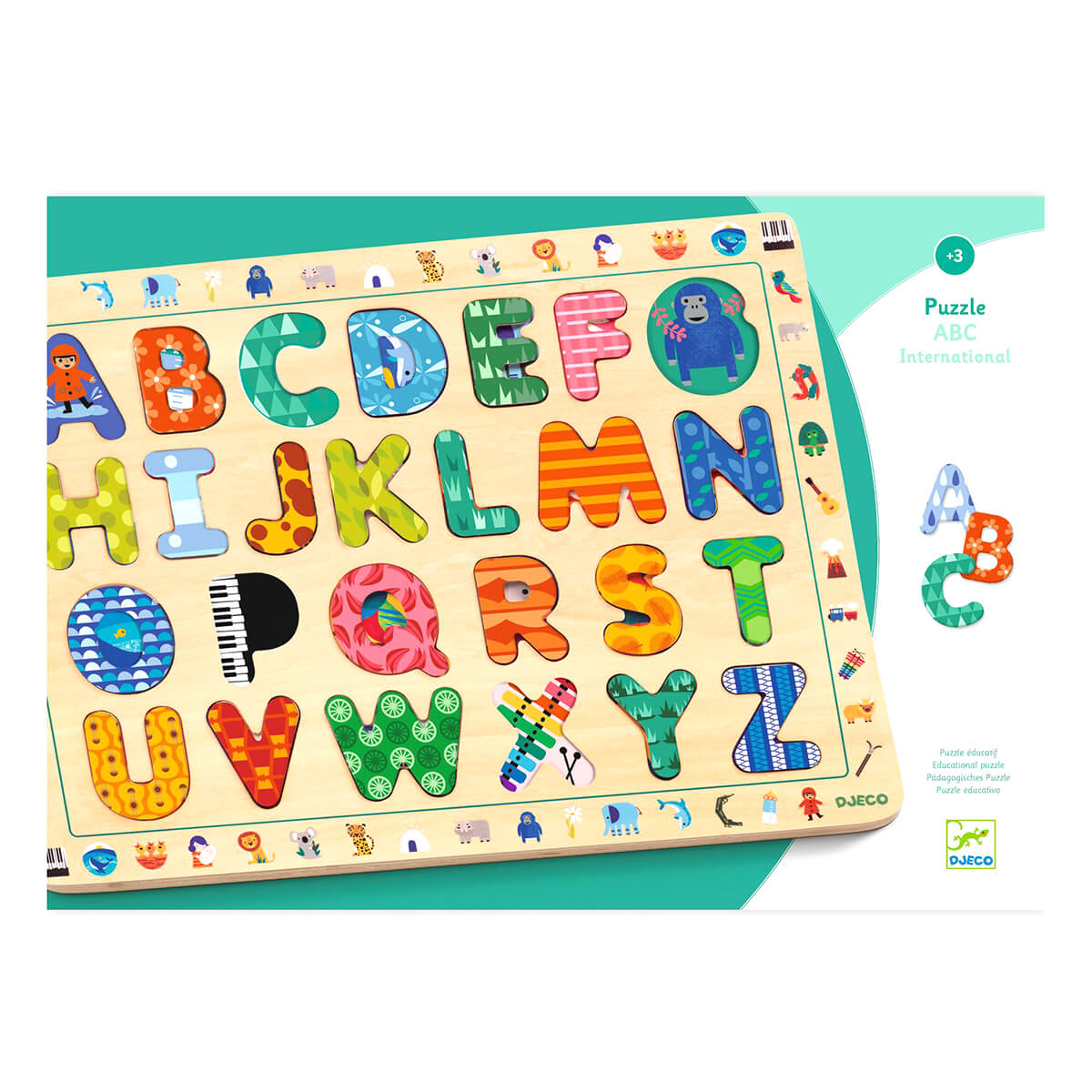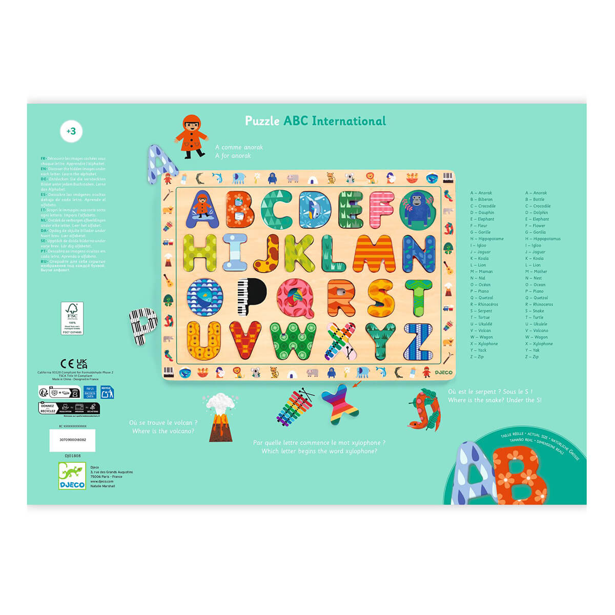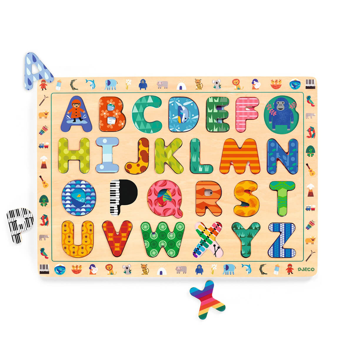 Alphabet Wooden Puzzle by Djeco. ABC is an educational wooden puzzle to start learning letters and the alphabet in French, English. Underneath each piece, children discover a picture associated with the letter. A for Anorak, P for Piano, etc. What letter does the word “xylophone” begin with?
