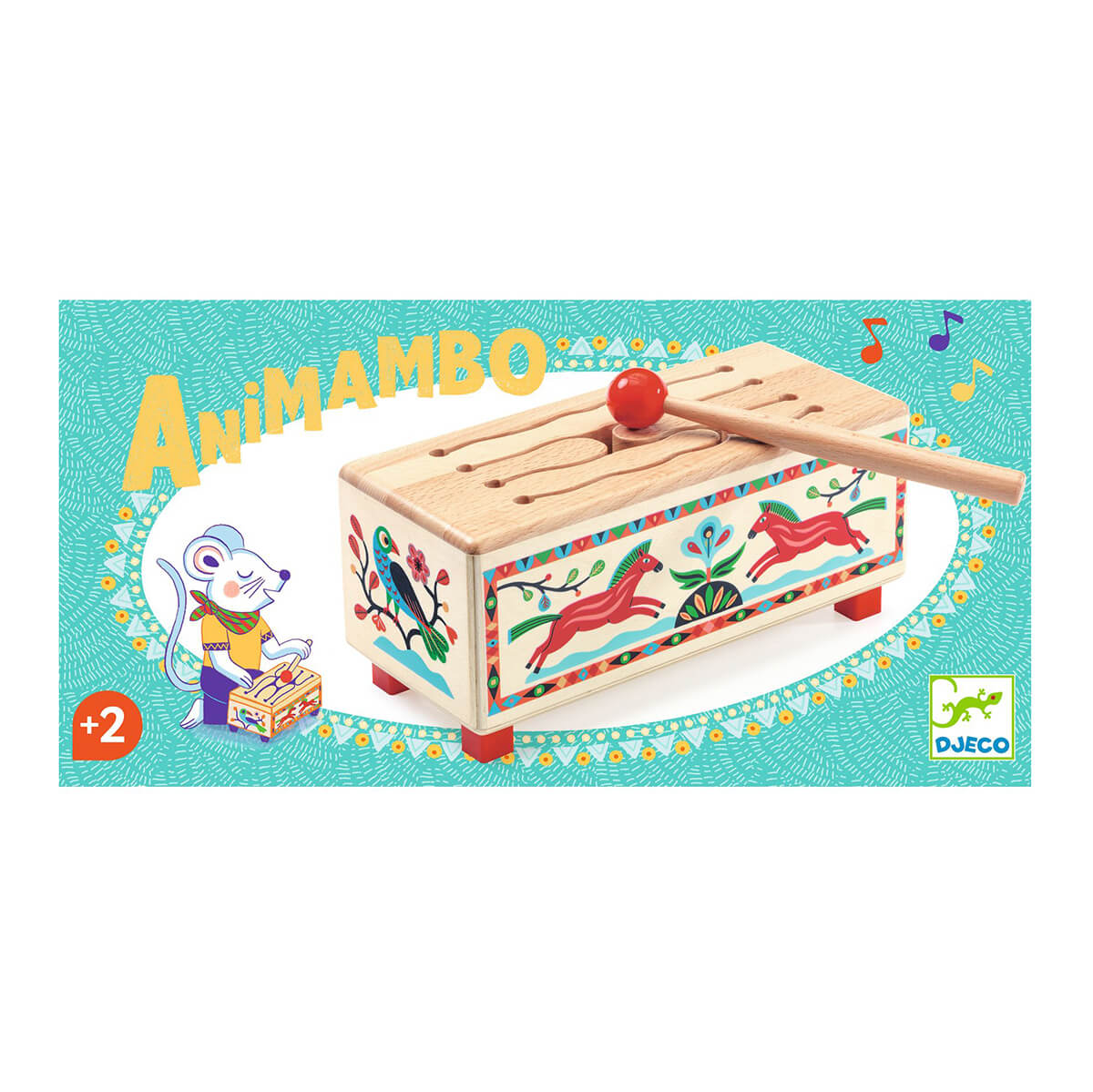 Animambo Wooden Drum by Djeco. A colourful wooden drum, unusual in its small size and beautifully illustrated with birds and horses. The child plays with a drumstick and listens to rich and relaxing sounds. An original instrument ideal for little musicians.