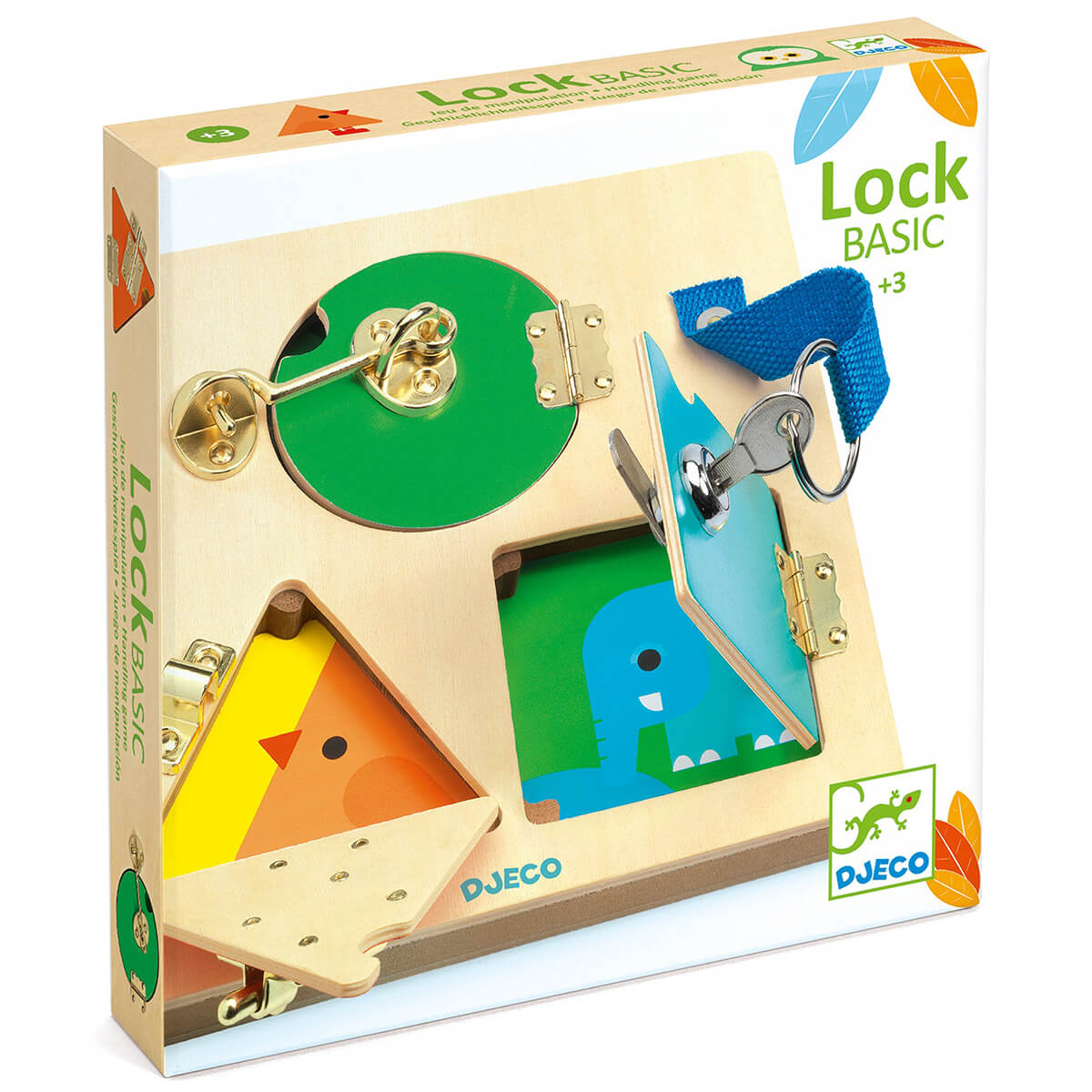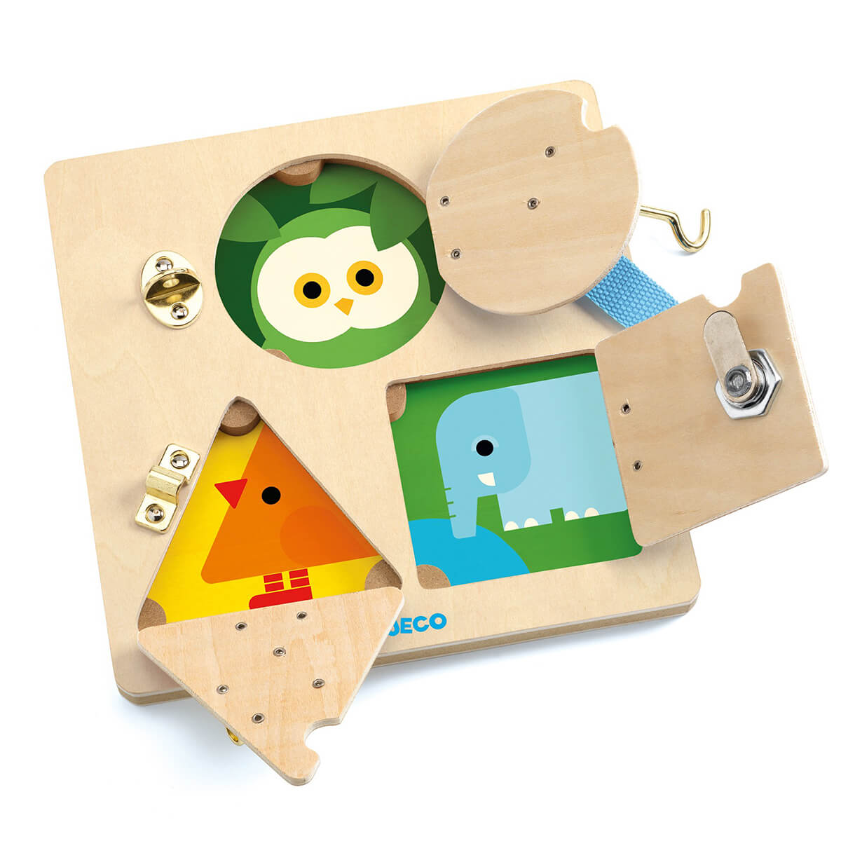 LockBasic puzzle by Djeco.  Includes a board with 3 locks and doors, work out how to open each lock and reveal an animal. The child has fun opening and closing the geometric doors to discover an owl, a chicken and an elephant.