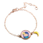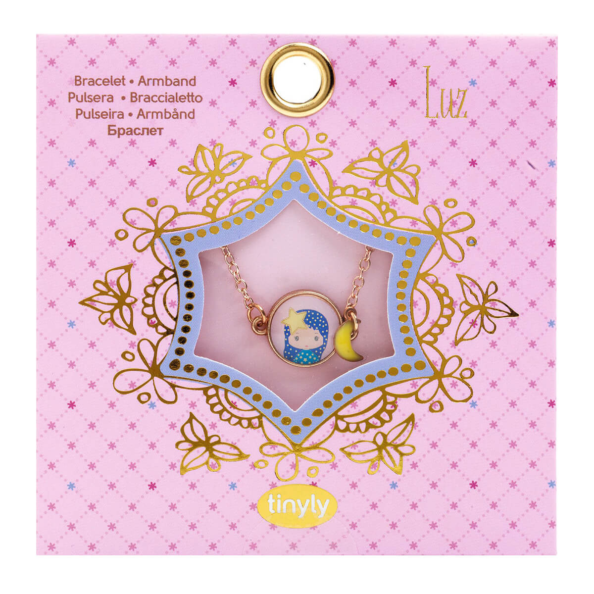 Tinyly Luz Bracelet by Djeco. A bracelet composed of a medallion representing the Tinyly “Luz” figurine on a gold metal chain decorated with a colorful moon-shaped charm. Showcased in a pretty printed pouch. Adjustable to the wrist thanks to its clasp.