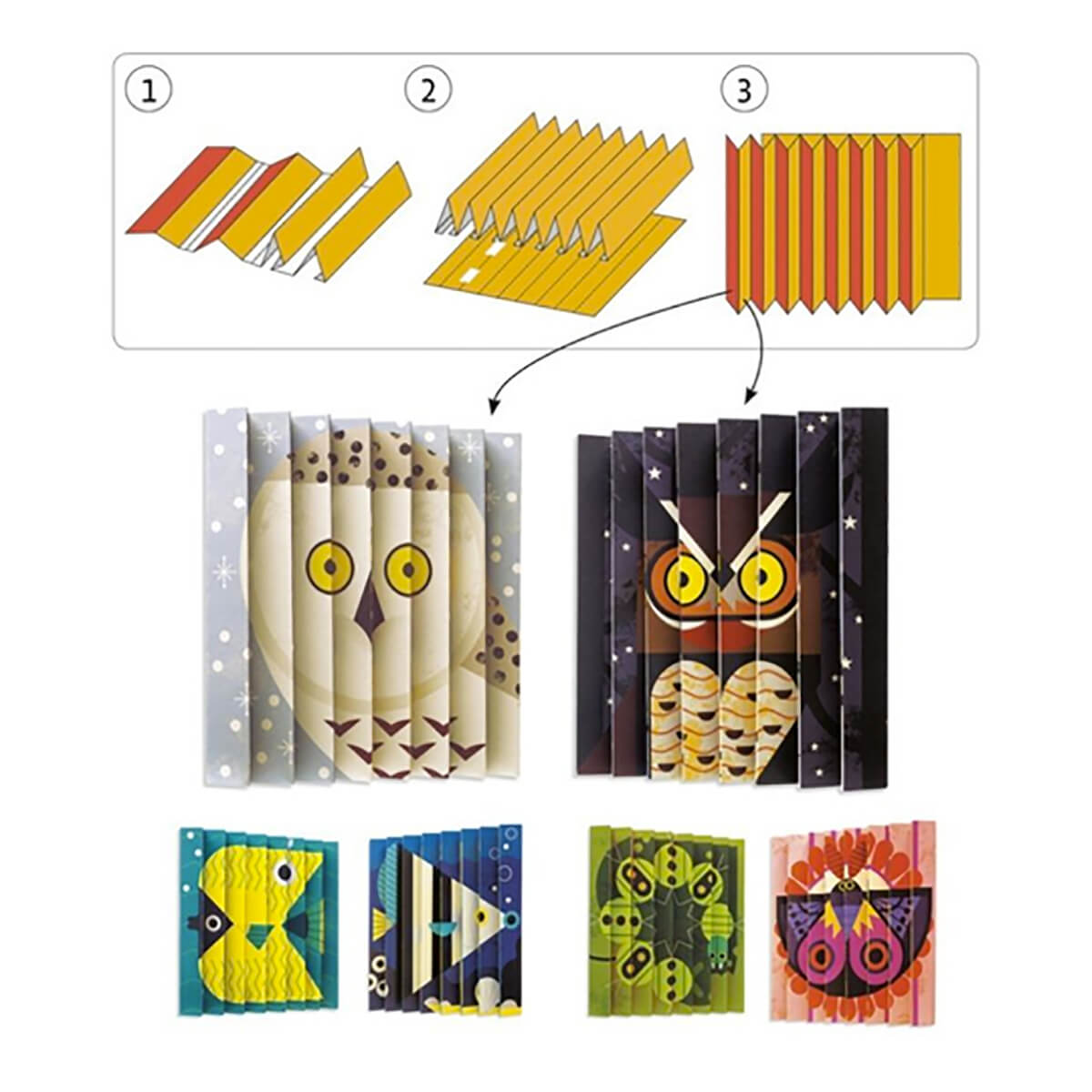 Wildlife picture pairs by Djeco. Create wildlife themed 2 in 1 pictures. Fold the illustrations and fixes with double sided tape. The set contains all the supplies to make 4 pictures and full instructions.