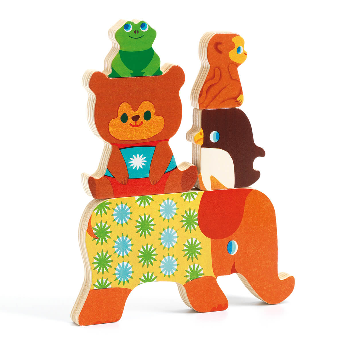 Woodypile wooden puzzle by Djeco. The puzzle has 5 chunky animals, that can stand, stack and fit back into the board