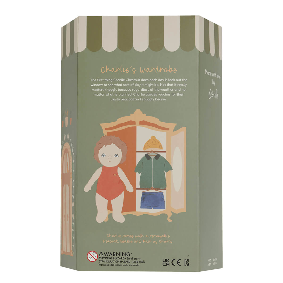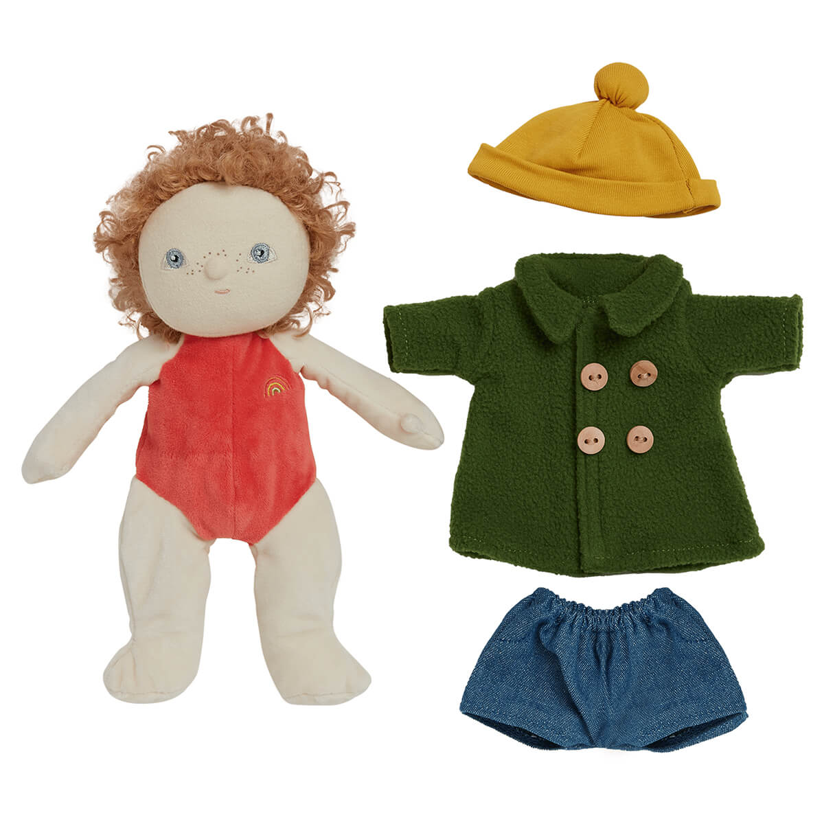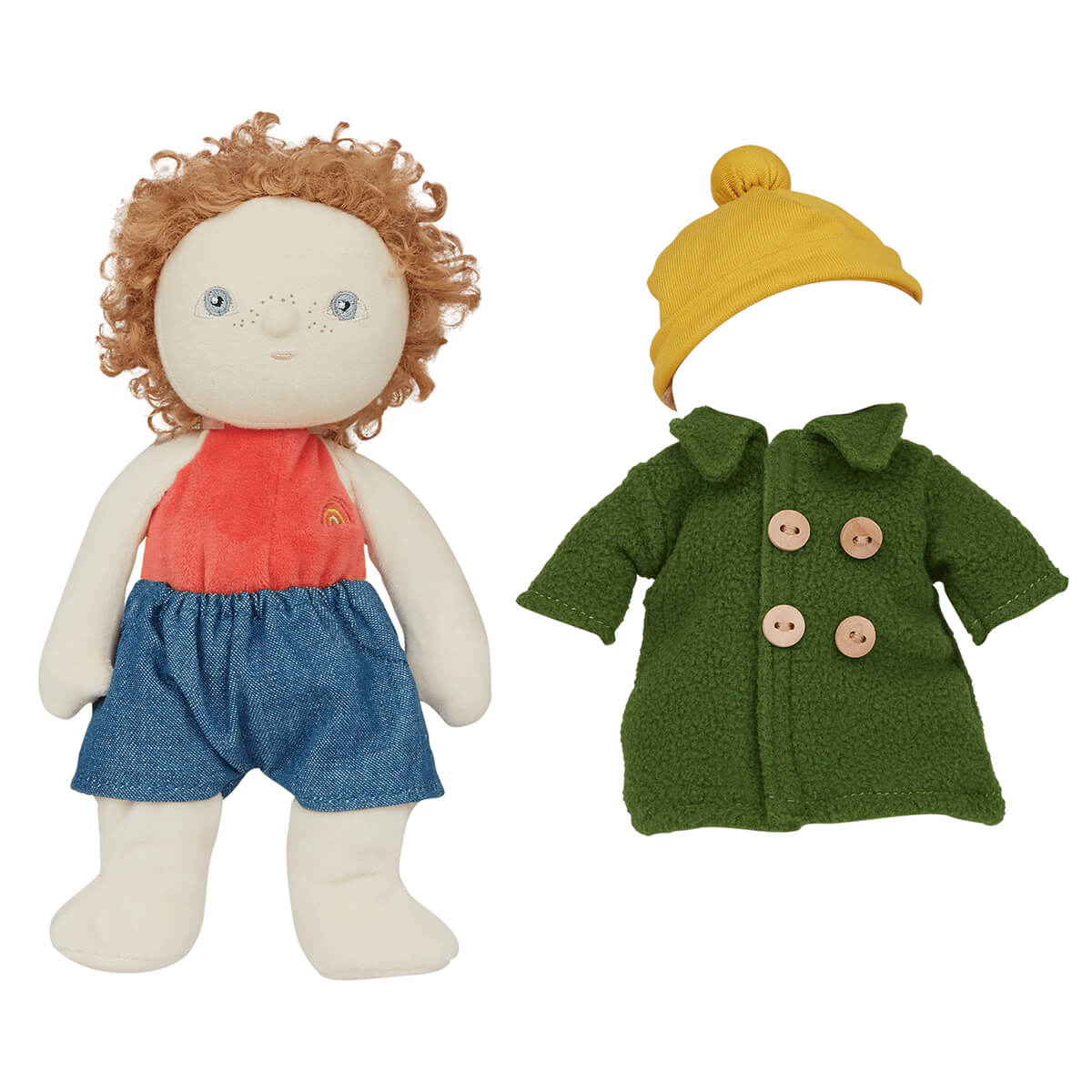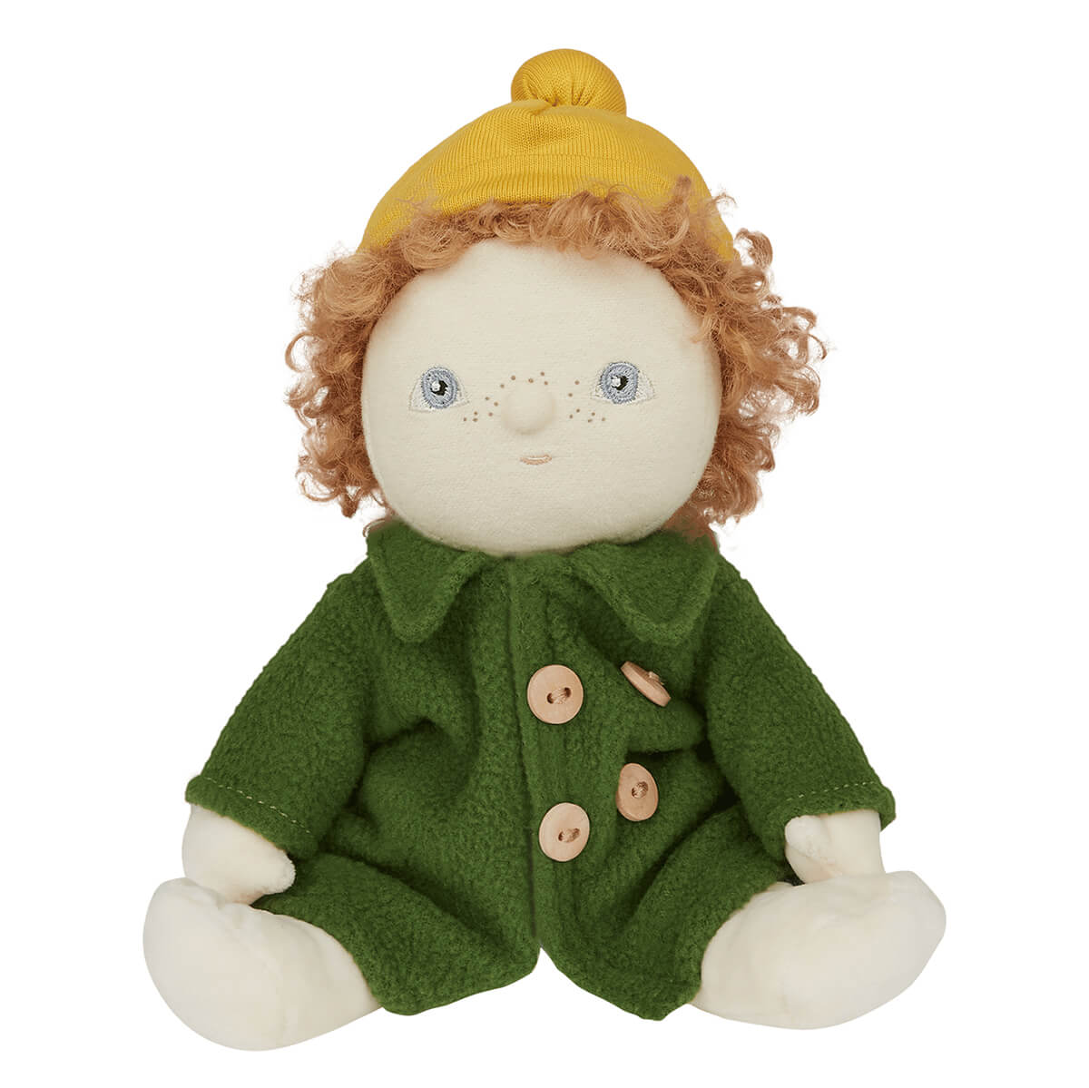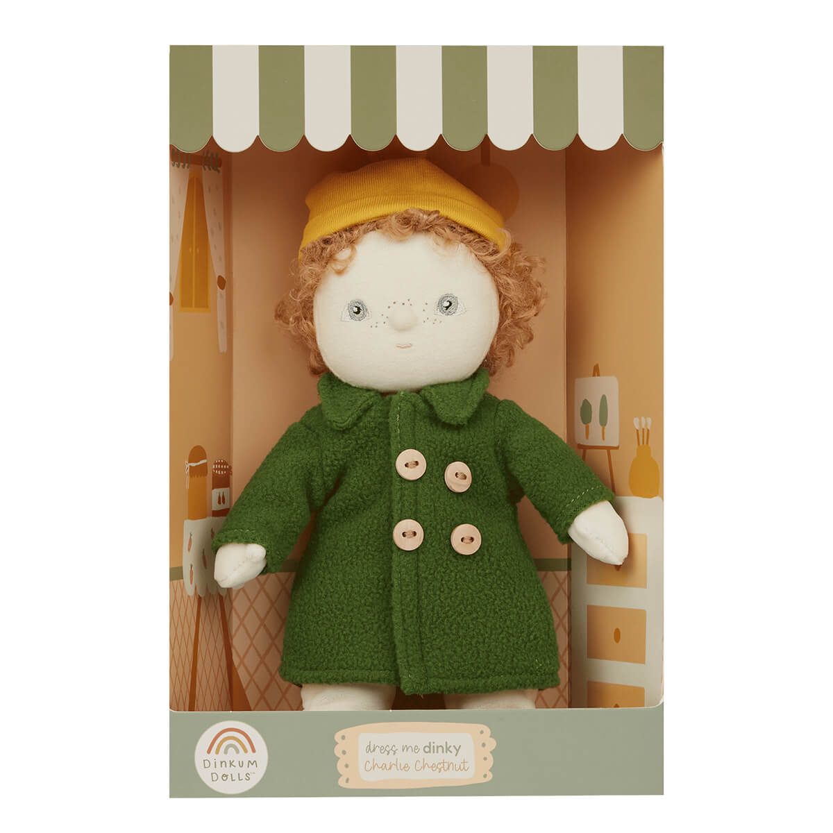 Charlie Chestnut Dress Me Dinky Dinkums Doll by Olli Ella. Dressed in a cheery yellow beanie and buttoned-up green trench coat, Charlie Chestnut is ready to dive into a world of make-believe! Will he lead a parade of Dinky's through the living room jungle, search for hidden treasures beneath the cushions, or dream up his next grand escapade in the garden? Charlie turns every day into a chance for big adventures, Dress Me Dinky’s are where stories begin, and memories are made, one outfit at a time. Charlie's little wardrobe is full of big dreams.