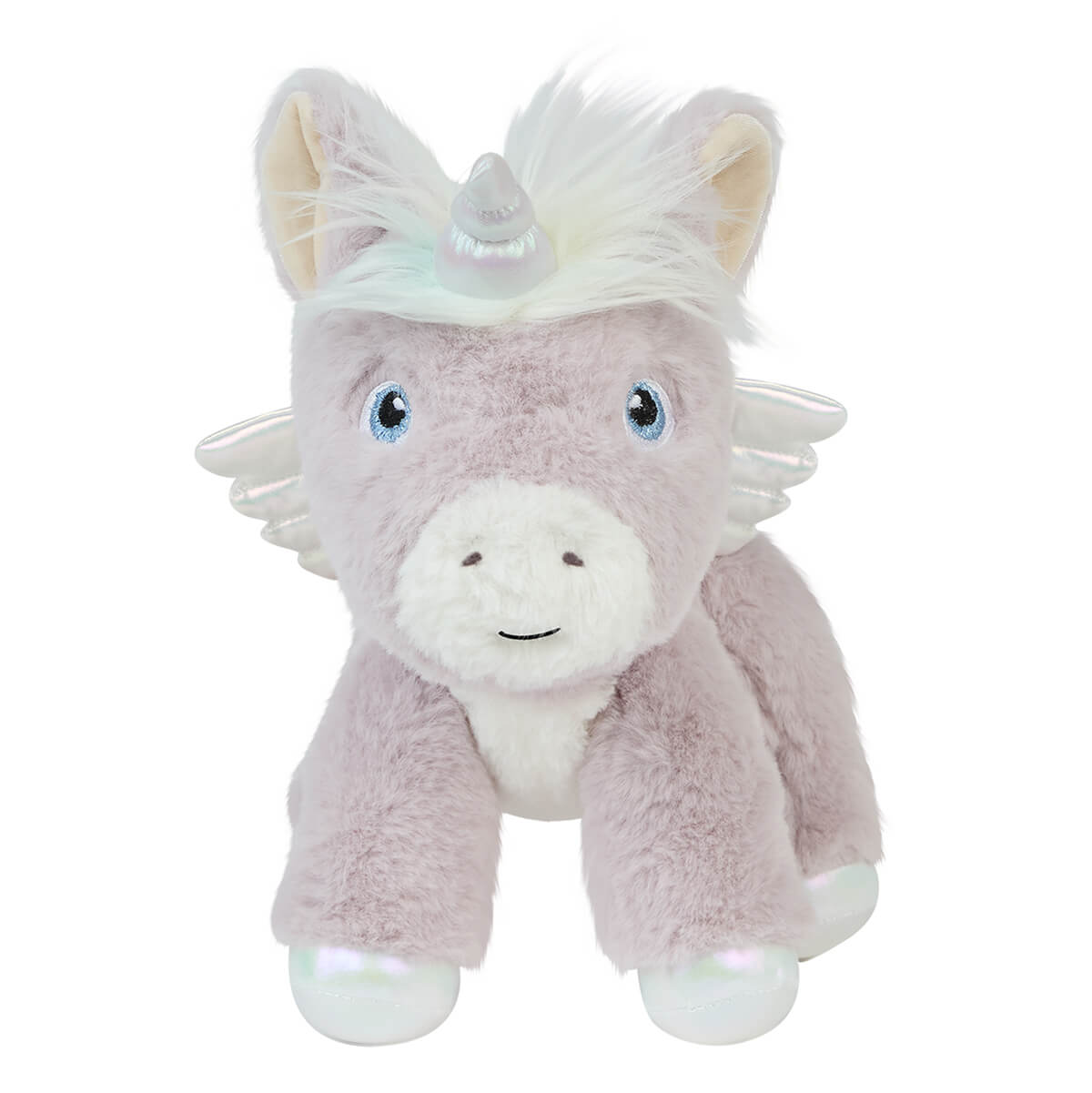 Fully posable with a head that twirls 360 degrees, Glimmer is ready to dazzle and delight. The iridescent accents on the hooves and wings, velvet inner ears, and plush rainbow mane and tail add an extra dose of unicorn magic.