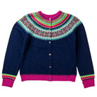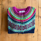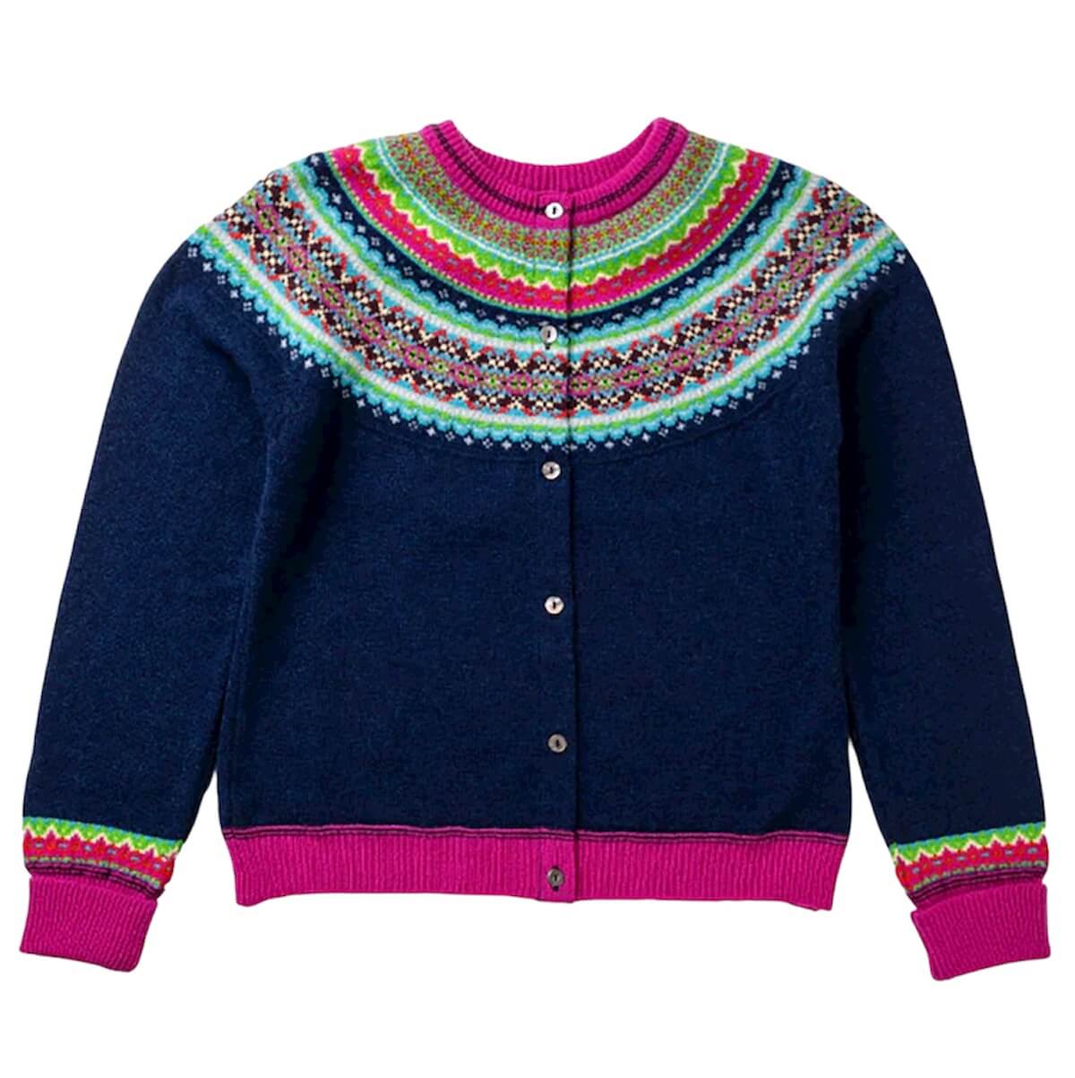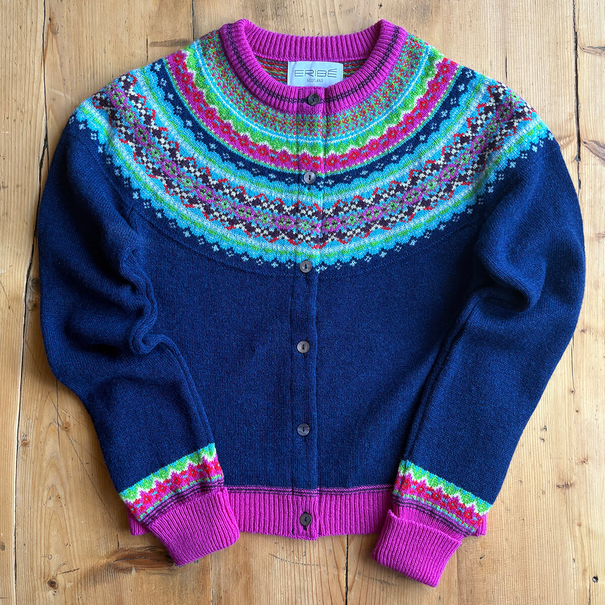 Alpine Short Cardigan by Eribé. This design is a contemporary take on the Scottish fairisle yoke pattern with a small rib hem around the hip. Above the long rib cuffs is small pattern detailing mimicking a bracelet. The cardigan is front opening and lined with grosgrain ribbon to hold the mother of pearl shell buttons. The cuffs are extra-long for extra warmth or to fit longer arms. The shape and sizing is slim fit and is hip length.