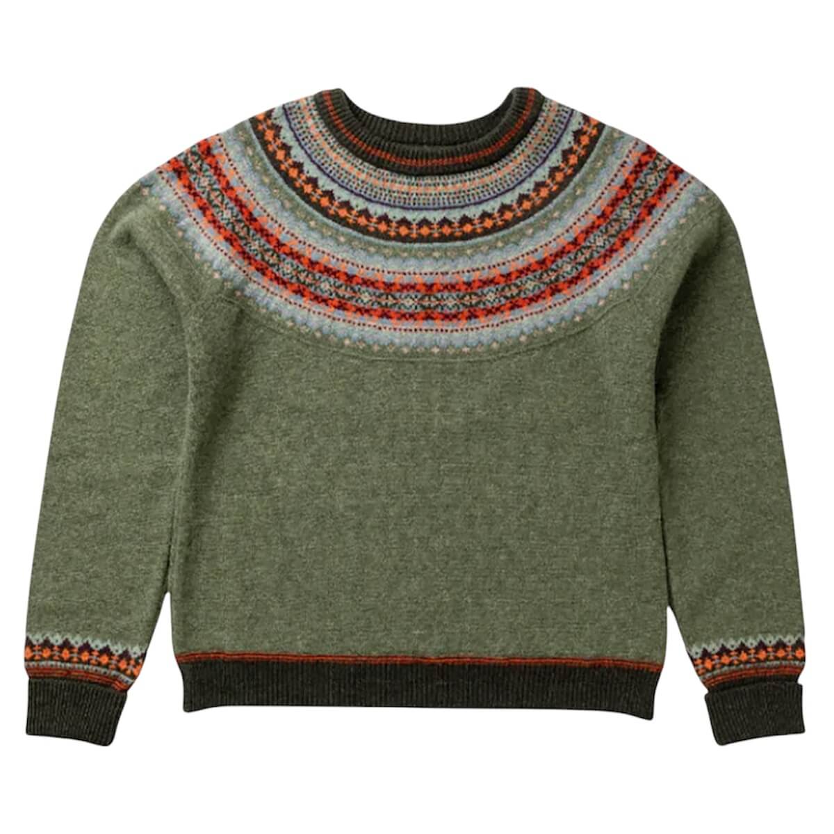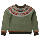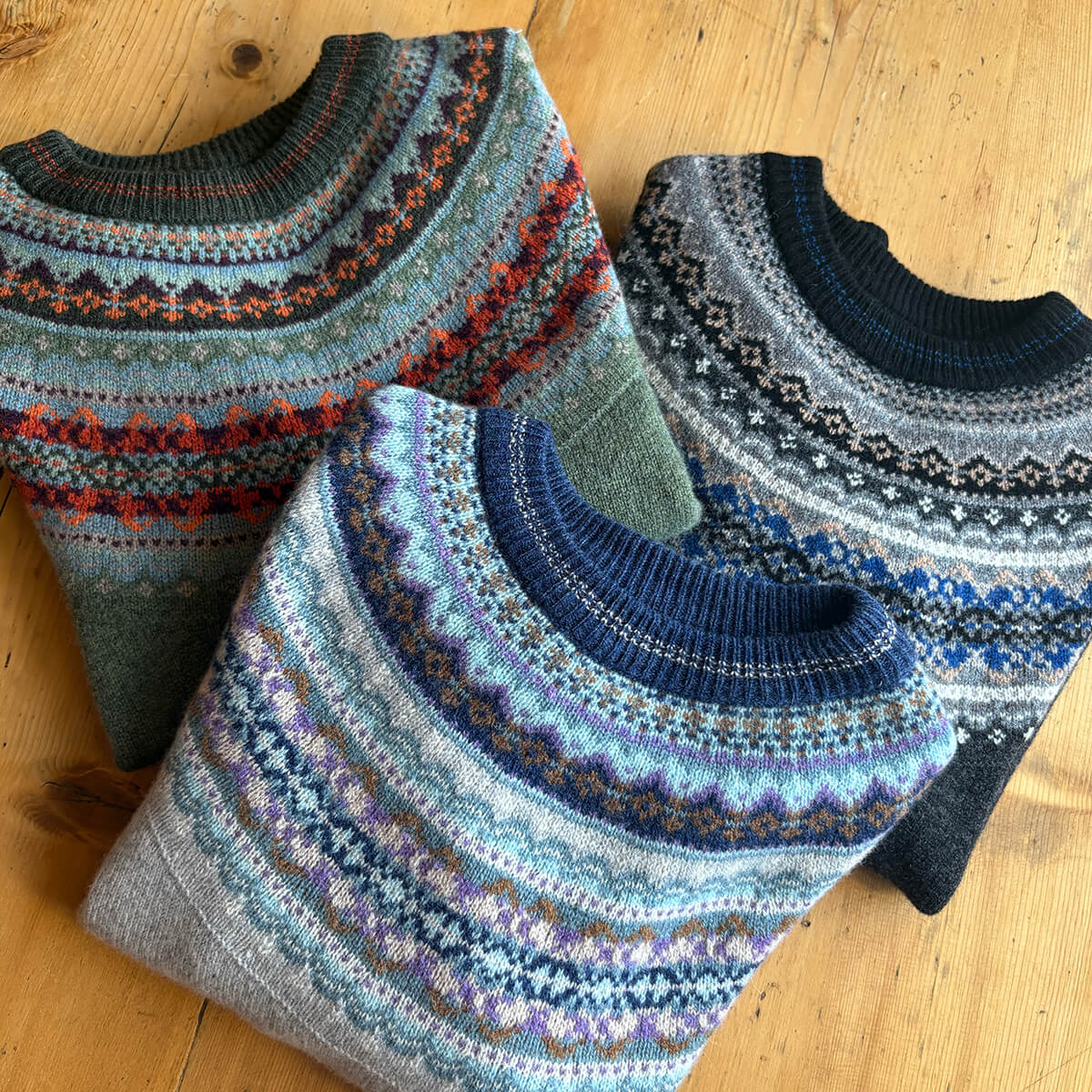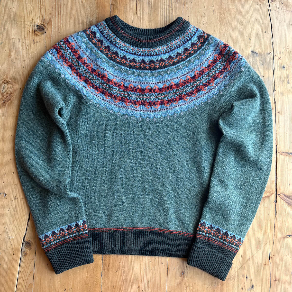 Alpine Short Sweater by Eribé. A modern interpretation of the Scottish Fairisle yoke pattern, this knitted jumper features a subtle rib hem around the hip for a contemporary touch. Above the elongated rib cuffs, small pattern detailing mimics a bracelet, adding a unique flair. The meticulously prepared colours, a process spanning months, result in a stunning palette. The extra-long cuffs not only provide additional warmth but also cater to those with longer arms. The shape and sizing is a regular fit and is hip length.