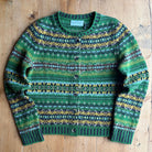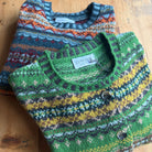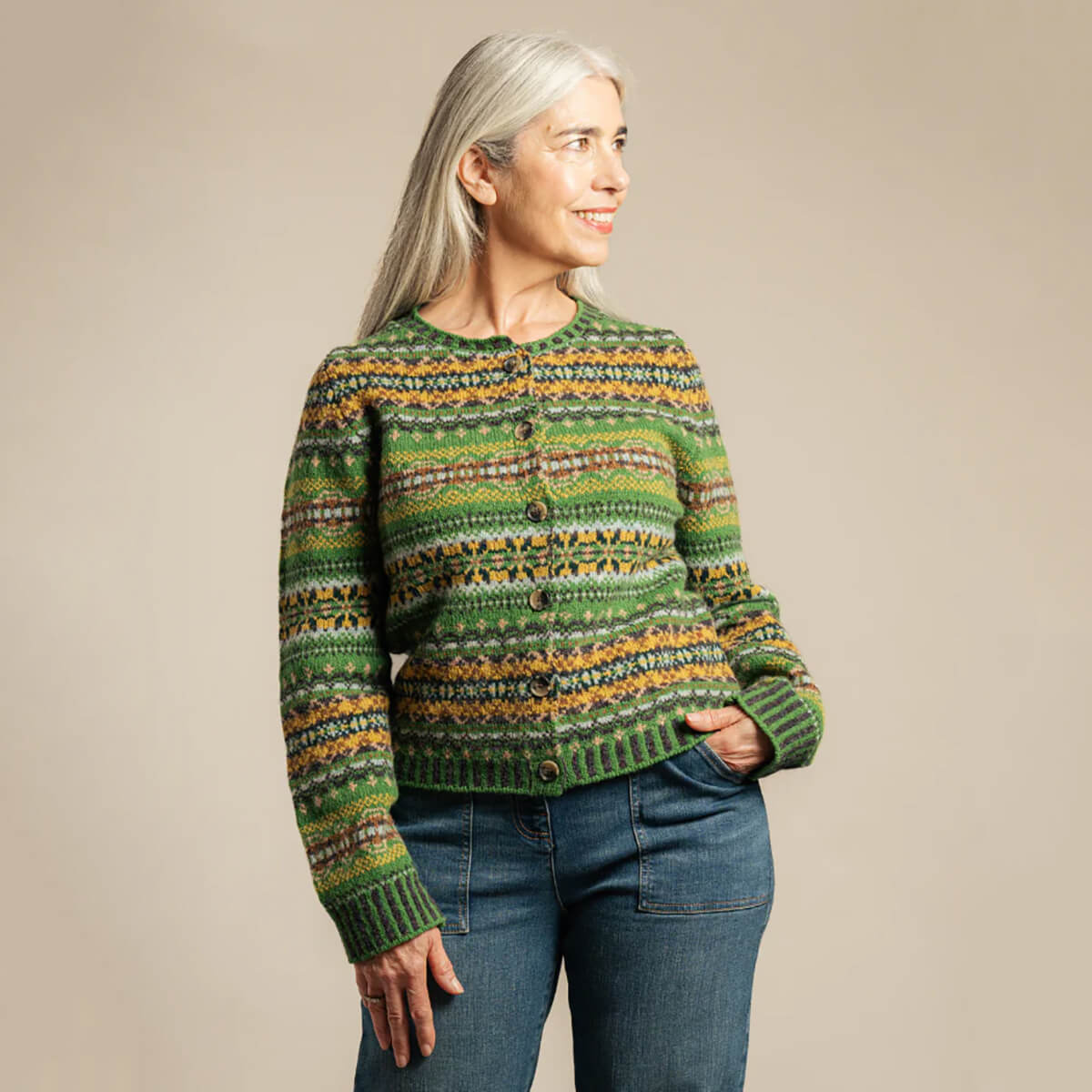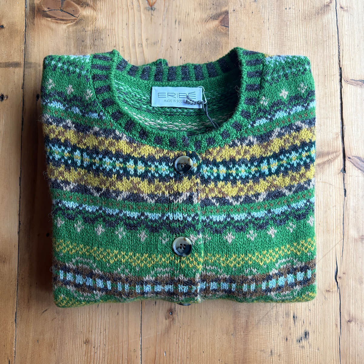 Westray Cardigan by Eribé. Over-hip length Fairisle cardigan with horn buttons, traditional striped pattern detail on hem and cuff. Knitted in supersoft wool.