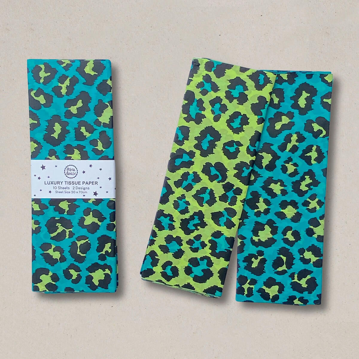 Leopard print luxury tissue paper by Petra Boase. Original and colourful animal print matt tissue paper for wrapping and crafting. Each pack contains five sheets in two different colours - jade and apple.