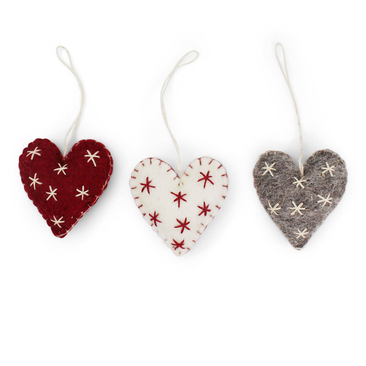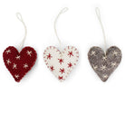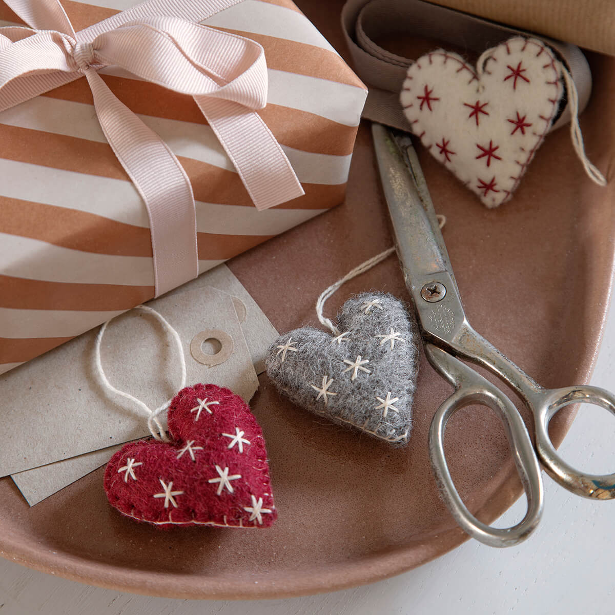 Set of three hearts with embroidered stars hanging Christmas decorations by Gry & Sif. Beautiful soft felted Christmas decorations in a Scandinavian style. Handmade and truly unique. Suitable for hanging from the Christmas tree, dangling from foraged branches or displayed in your window for a hygge Danish Christmas. Set of three traditional Danish colours - red, white and soft grey.