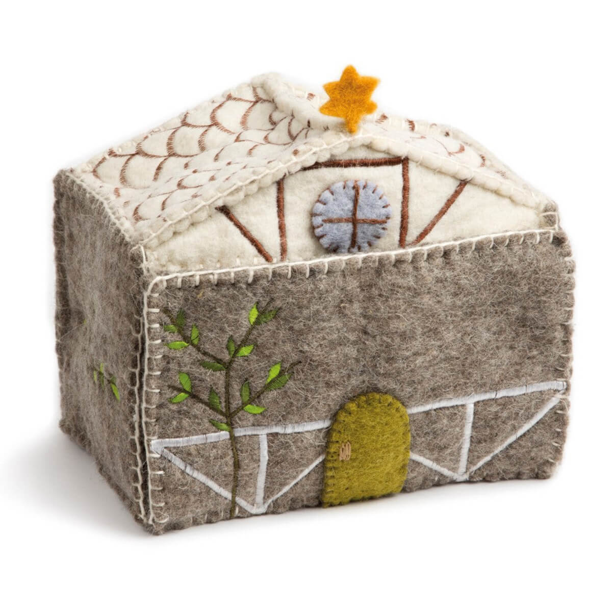 Nativity Set including dolls and animals by Gry & Sif. A beautiful handmade nativity set in a Scandinavian style with soft, felted wool figures and stable. Handmade and truly unique. All the figures fit inside the soft-sided structure. Pull down the front of the Stable to create the Christmas story in action.