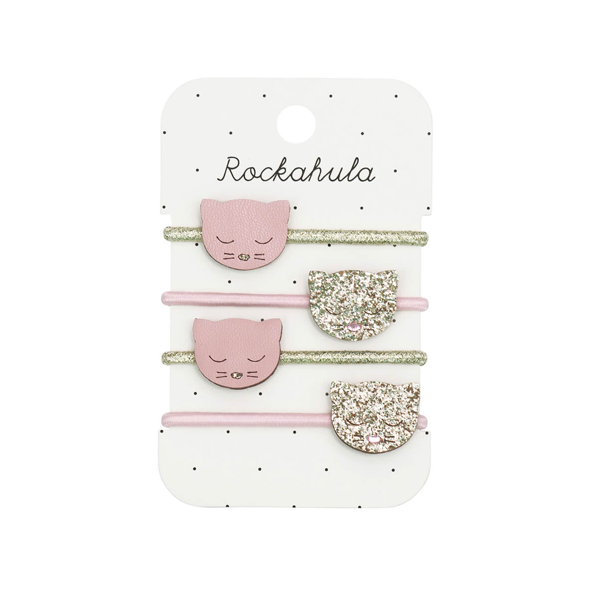 Clara Cat Ponies by Rockahula Kids. This pack of four ponies are the purrr-fect way to add a little shimmer to your day! Two shimmering gold cats and two pink PU cats secured to gold and pink elastics.
