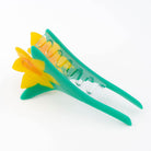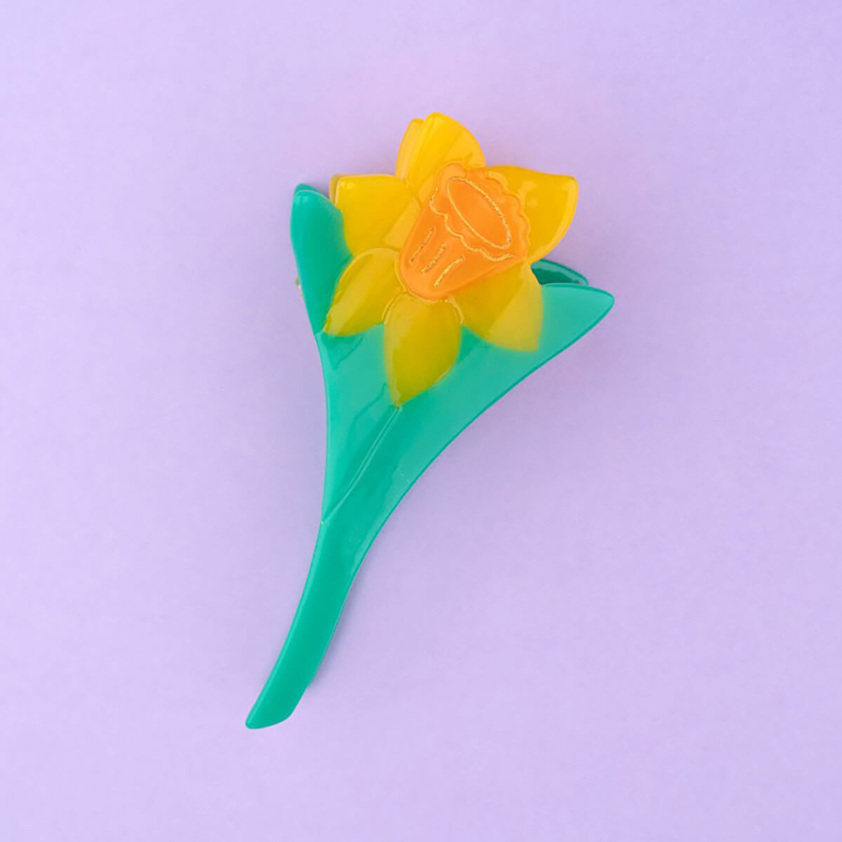 Daffodil hair claw by Coucou Suzette. An elegant full acetate single daffodil hair claw in yellow and green to bring poetry and softness to your hair-up. Made from plant-based eco-friendly cellulose acetate.
