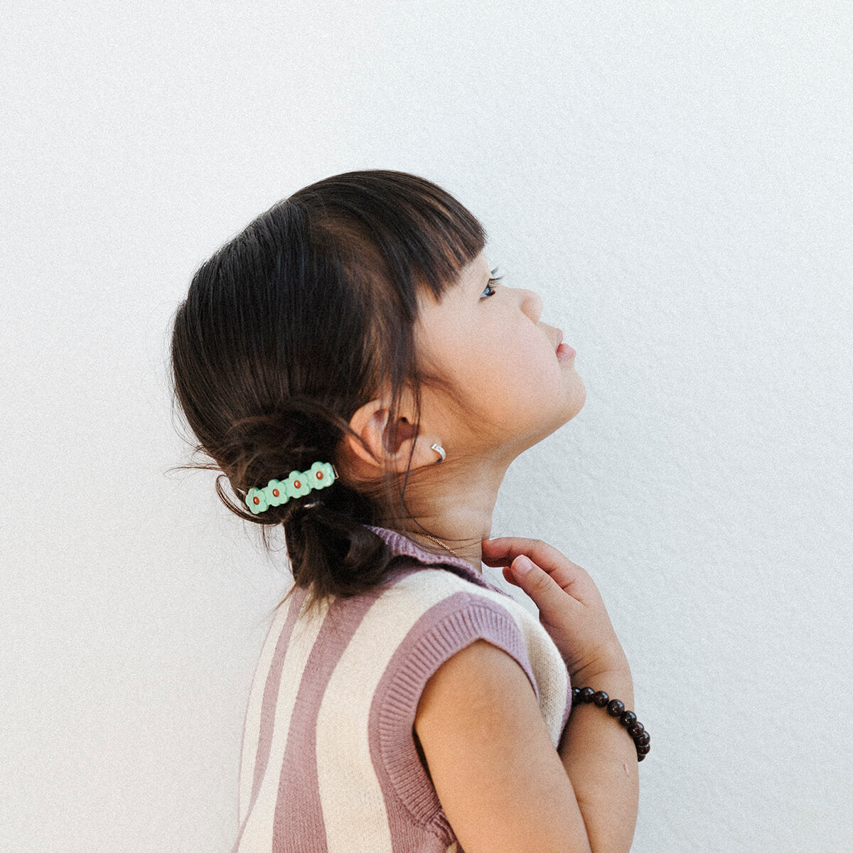 Flower Hair Clip by Wunderkin Co. Four flower bar hair clip. Handmade in France, this flower clip is made from plant-based eco-friendly cellulose acetate set onto a silver tone crocodile clip. Perfect for holding back stray hairs and fringes. Wear individually or combine two or three clips at the same time.