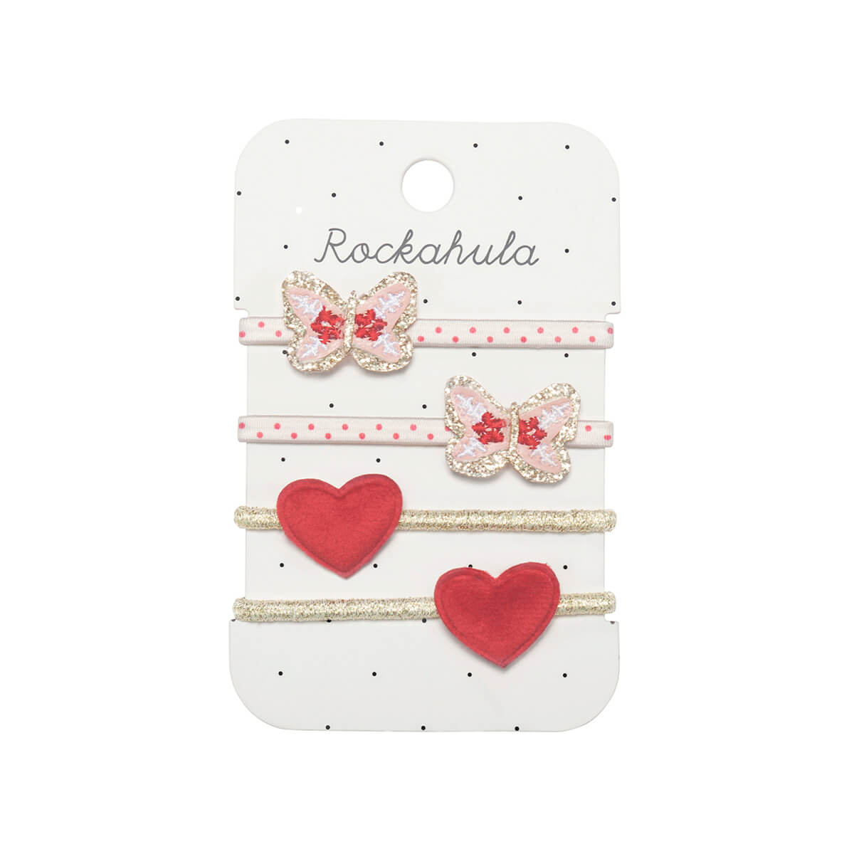 Folksy butterfly ponies by Rockahula Kids. Flutter by like a folksy butterfly! This pack of four ponies include two folksy butterflies on spotty elastics and two red velvet hearts on gold elastics.