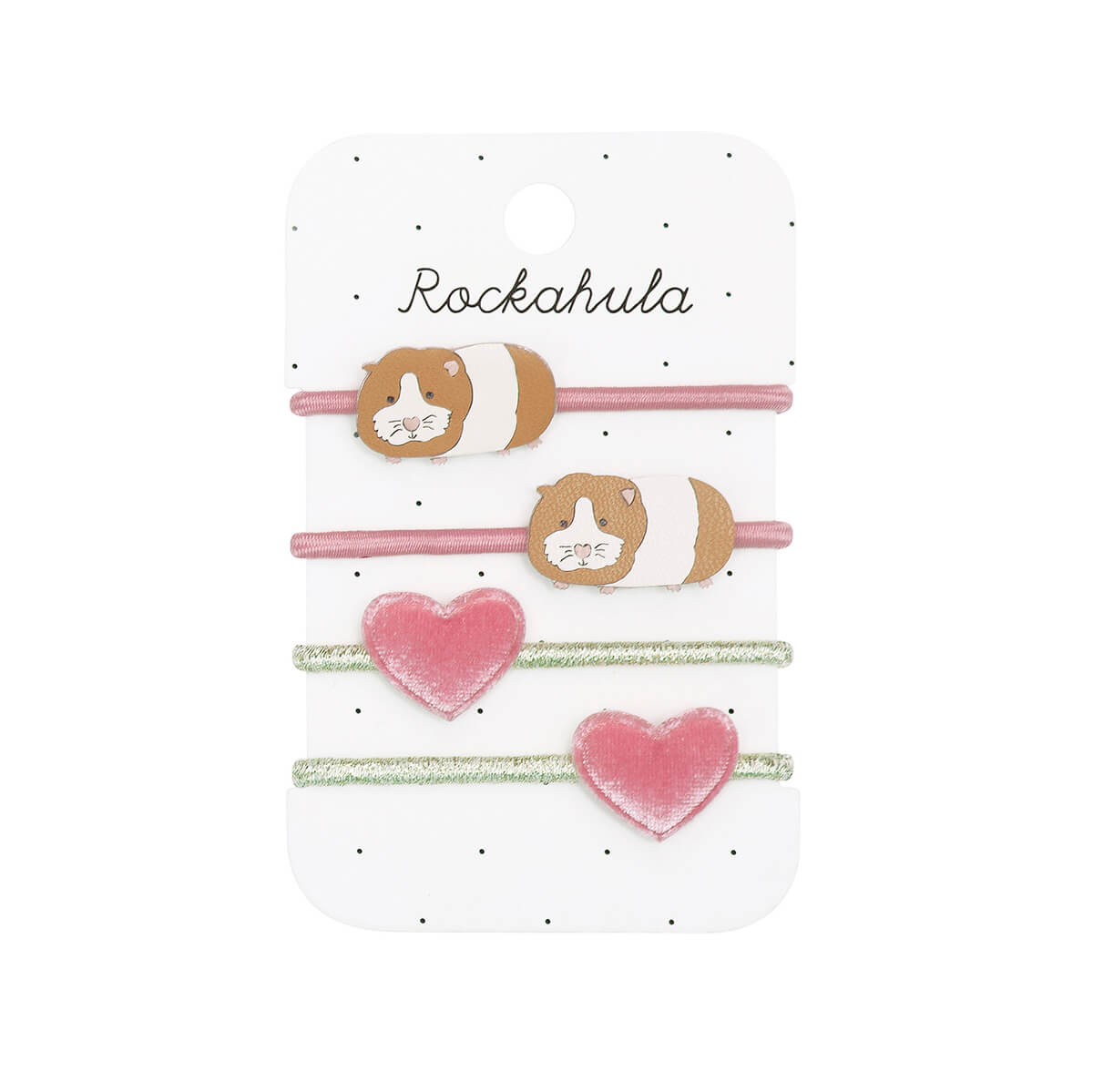 Glenda Guinea Pig ponies by Rockahula Kids. This four pack of ponies feature sweet little guinea pigs and the softest velvet hearts! Each little pig is delicately detailed with a soft pink nose, whiskers and teeny feet.