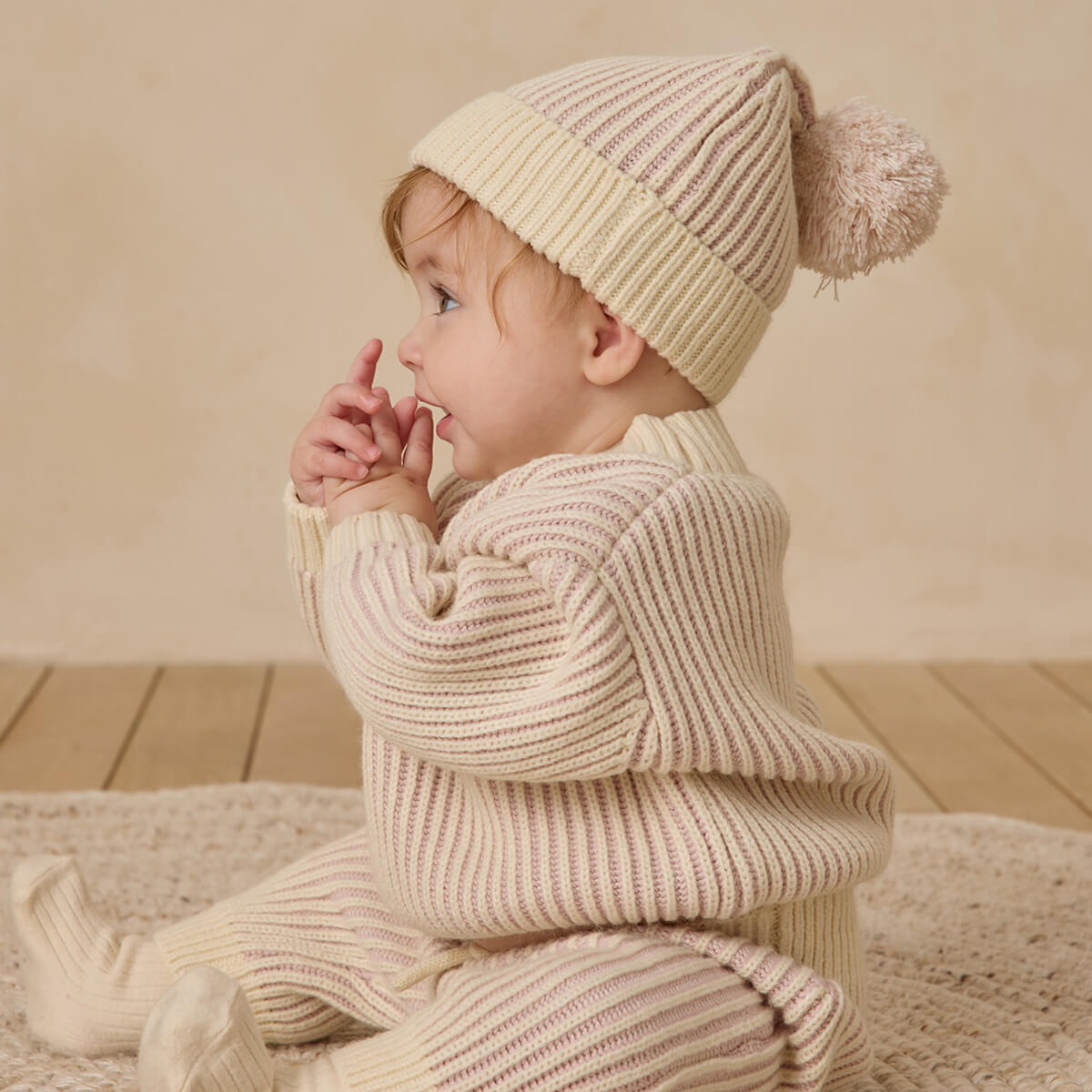 Beanie by Quincy Mae. This cosy knit hat features contrast ribbing and a playful pom pom, making it the perfect finishing touch for little ones’ cold-weather outfits.
