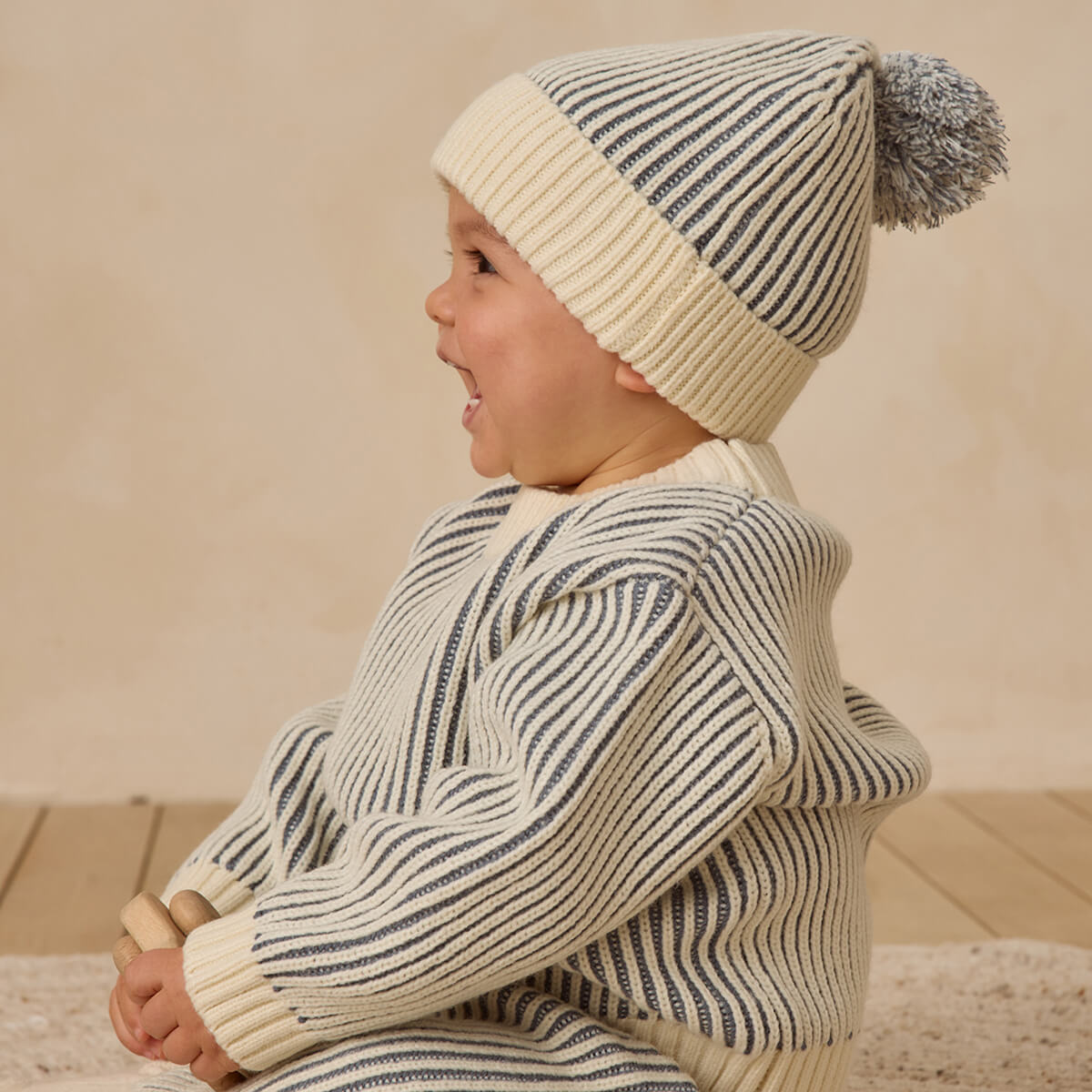 Beanie by Quincy Mae. This cosy knit hat features contrast ribbing and a playful pom pom, making it the perfect finishing touch for little ones’ cold-weather outfits.