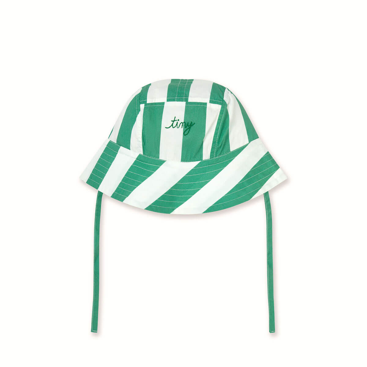 Stripes Bucket Hat by Tinycottons. A timeless style with an original twist. This bucket hat featuring the emerald stripes print is crafted from playful crispy poplin fabric. It includes a small woven label with the embroidered logo on the front, adding that signature Tiny touch. Perfect for sunny days, this hat perfectly blends classic style, personality, and functionality.