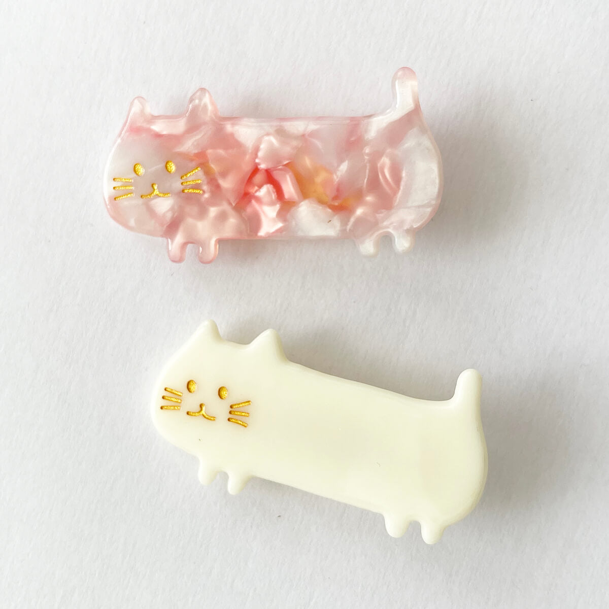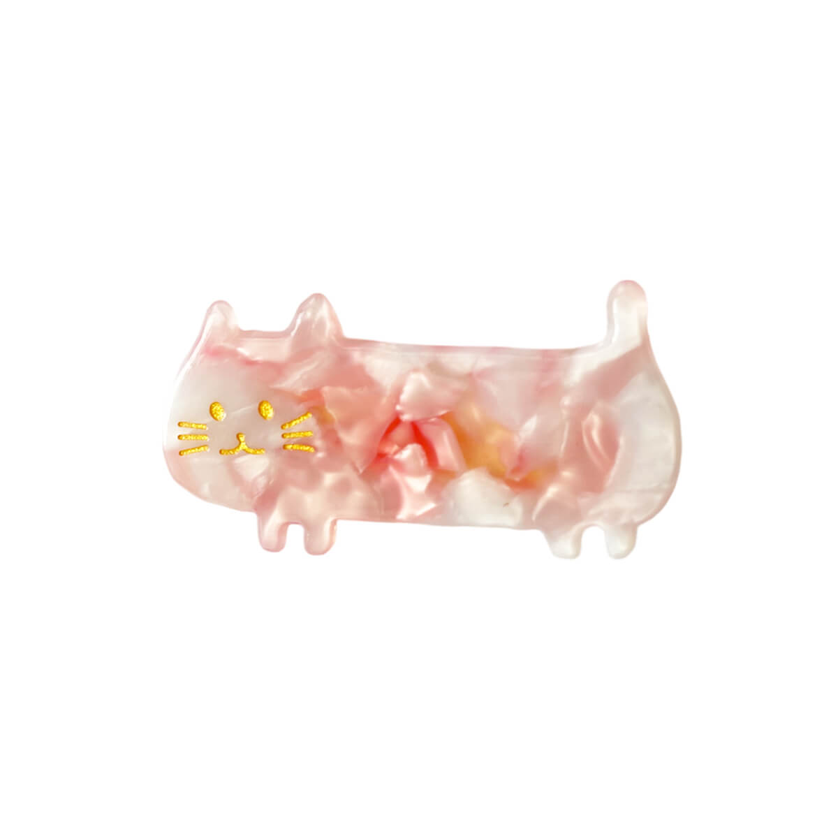 Sakura Kitty hair clip by Hello Sakura. Your choice of a pretty marbled acetate cat with gold details on a gold tone alligator hair clip. Made from plant-based eco-friendly cellulose acetate.