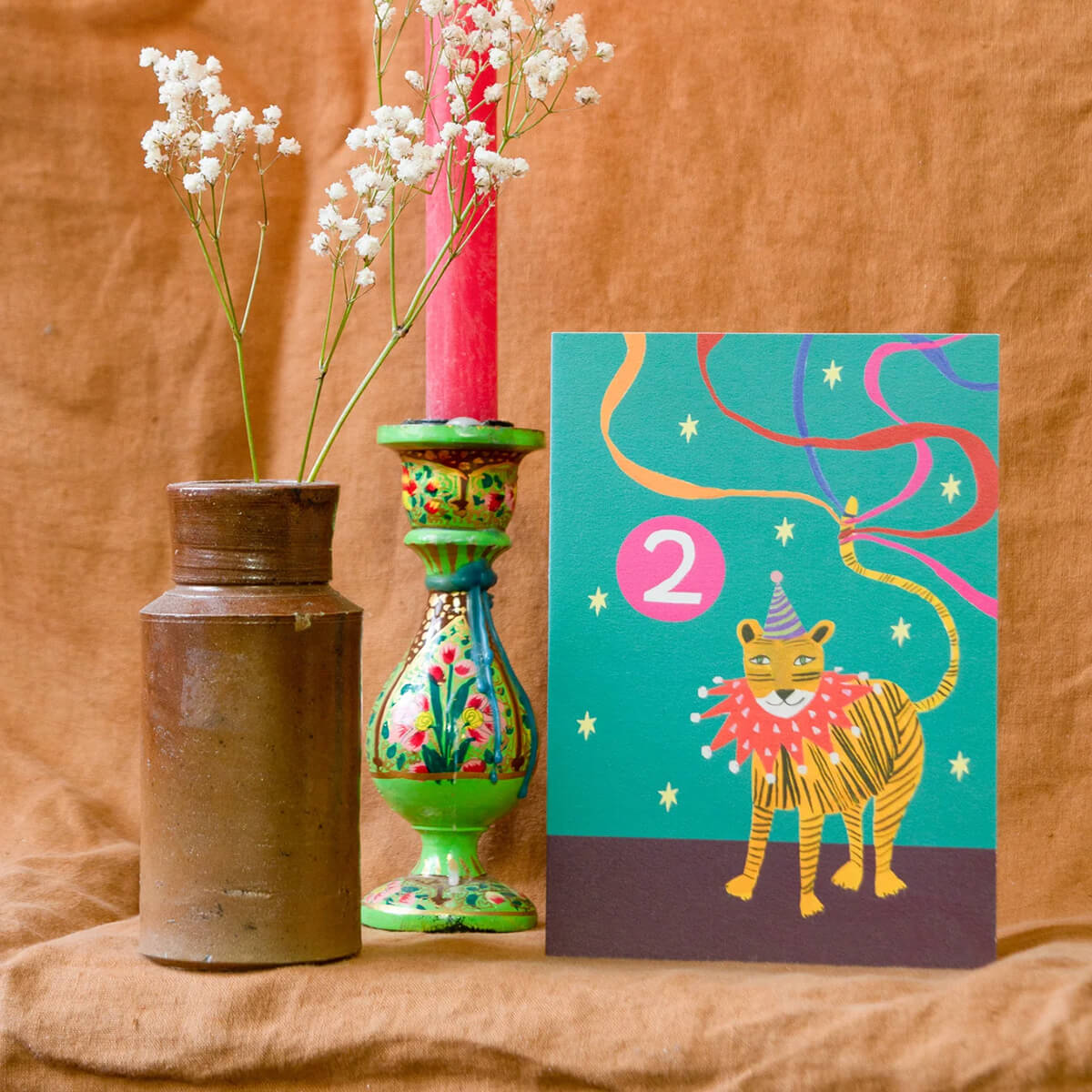 Age 2 Party Tiger Birthday Greetings Card by Hutch Cassidy. Celebrate a terrific two year old with the magical 'Party Tiger'. Looking ravishing in a party hat and collar this fantastical feline is definitely party ready.