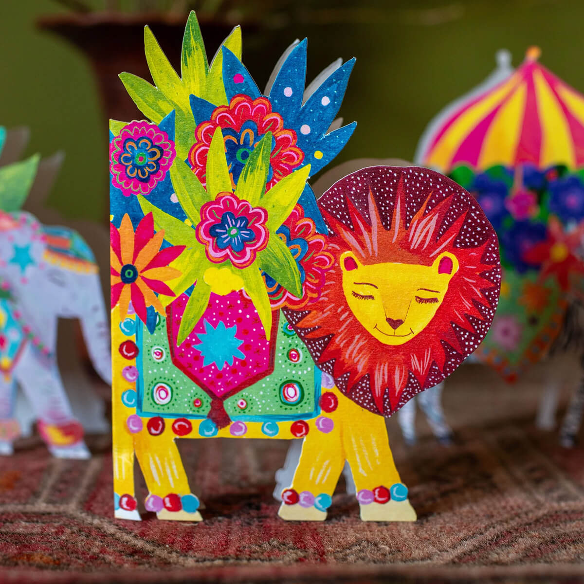 Lion Parade Die Cut Birthday Greetings Card by Hutch Cassidy. This most fabulous lion is ready to send wonderful greetings. A truly joyous card, this magical paper treasure will be sure to capture your loved ones imaginations. These cards make wonderful keepsakes and paper ornaments and are guaranteed to provide joy and magic to loved ones.