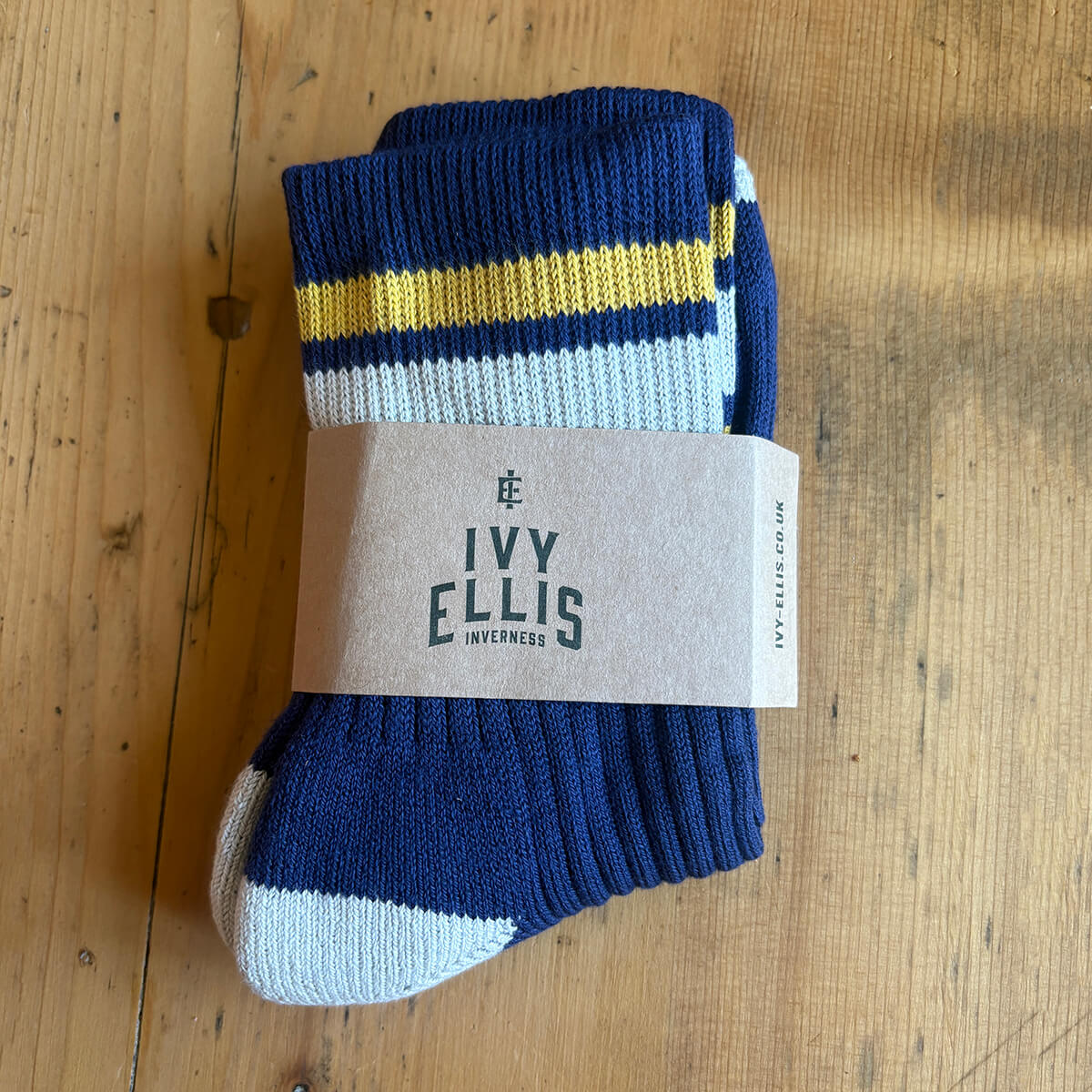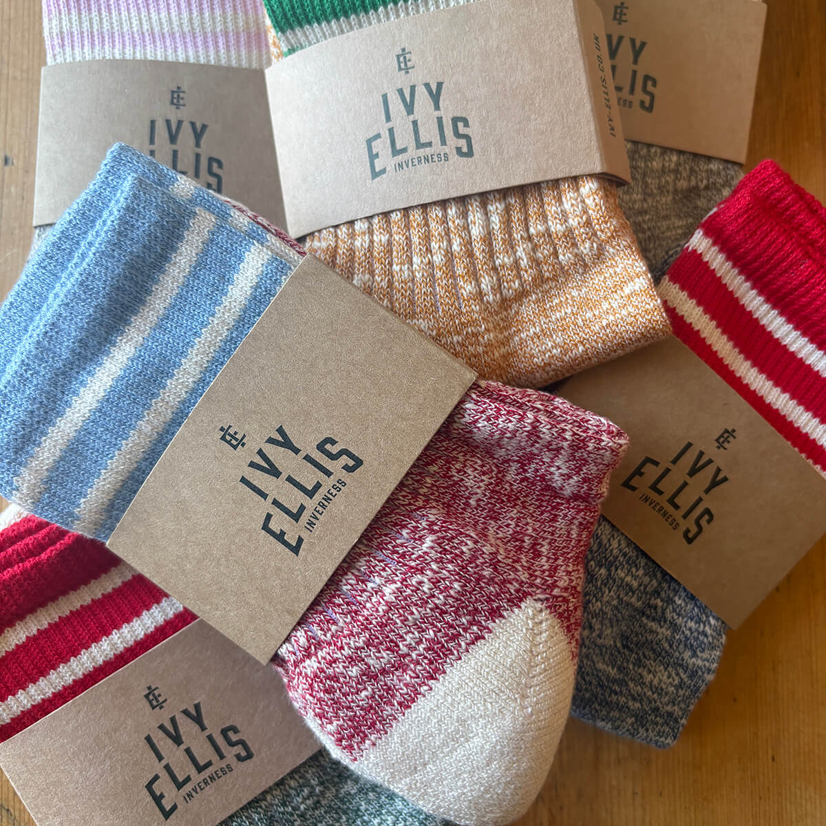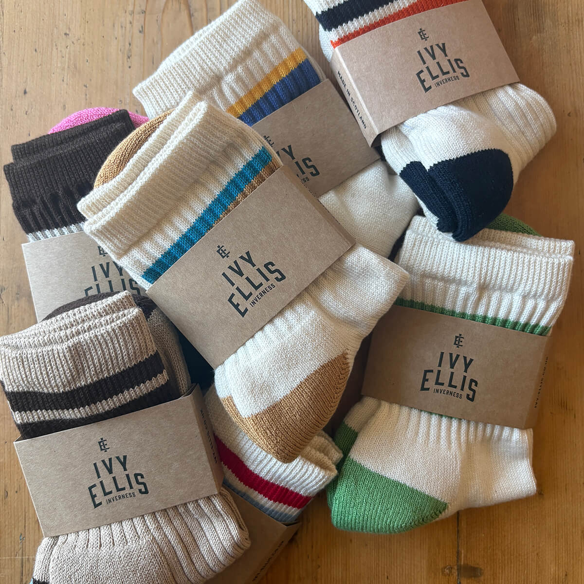 At Ivy Ellis, striped socks are more than just an accessory – they are a celebration of heritage, craftsmanship, and timeless style. Ivy Ellis started in 2020 as a little side project during lockdown, drawing inspiration from growing up in the 80s and American sportwear, varsity fonts and colourways from Ivy League universities. Every pair of Ivy Ellis socks are designed in the UK and crafted in a small, family run factory in the Scottish Highlands. Ivy Ellis make small runs of each design, operating sustainably and making a lasting, quality product. Whether you’re drawn to bold, vintage sports colours or understated preppy Ivy League shades, Ivy Ellis offers a curated collection of striped socks that combine heritage style with modern craftsmanship. Explore the collection today and find the perfect pair to suit your style.