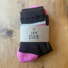 The Queenie women's puck socks by Ivy Ellis. Handcrafted with precision, The Queenie socks are made from ribbed deep purple yarn, offering a distinct texture and appeal. Featuring a pink heel and toe, these socks are finished with a soft elasticated top in contrasting pink and cream for added hold, ensuring they stay perfectly in place throughout the day. These socks provide breathable durability and a snug fit, making them perfect for everyday wear. Reinforced heel and toe details enhance longevity.