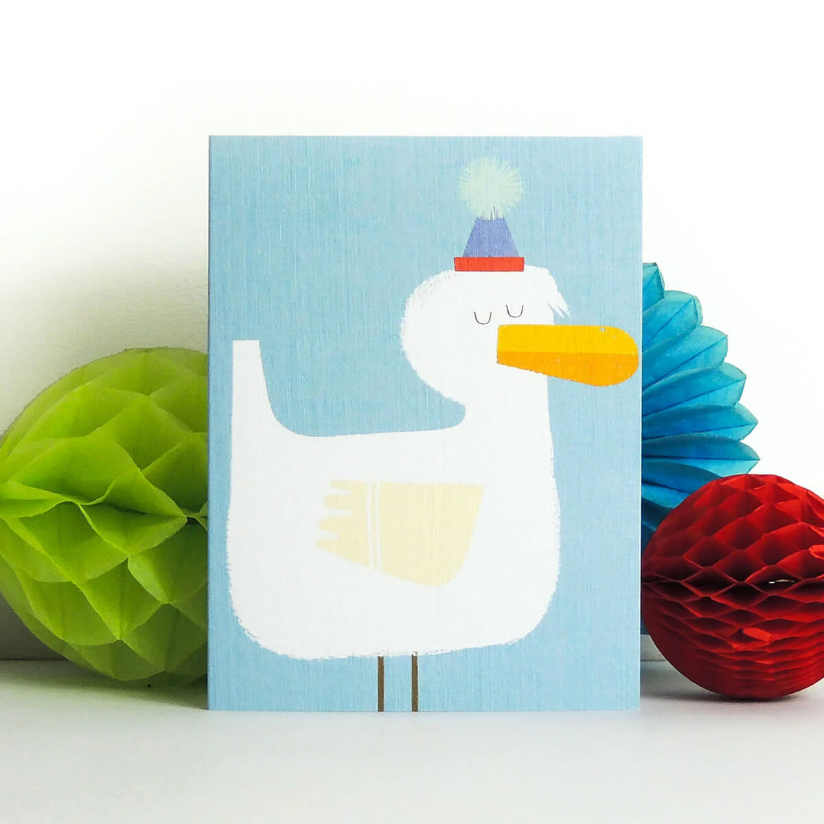 Mini Duck Birthday Greetings Card by Kali Stileman Cards. A sweet and smiley duck on a muted blue background. This mini card is perfect for birthdays, new babies or just to say hello!