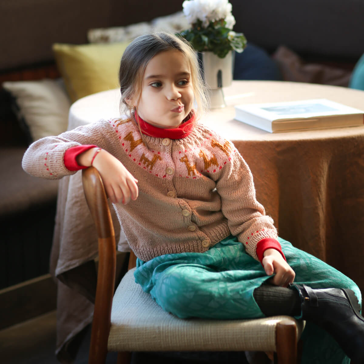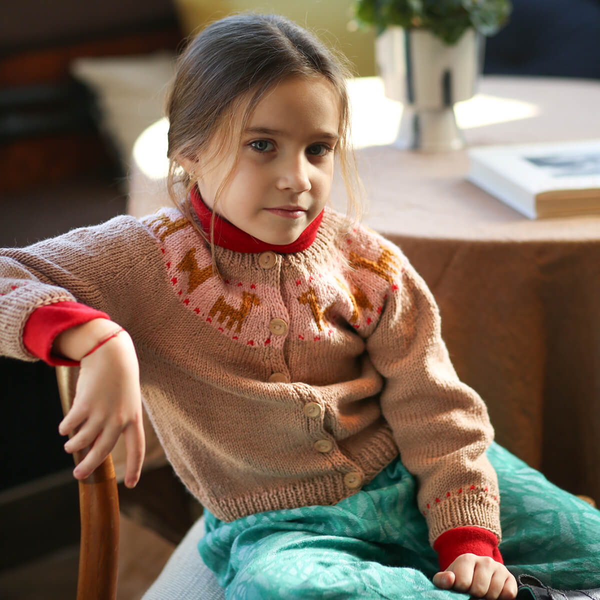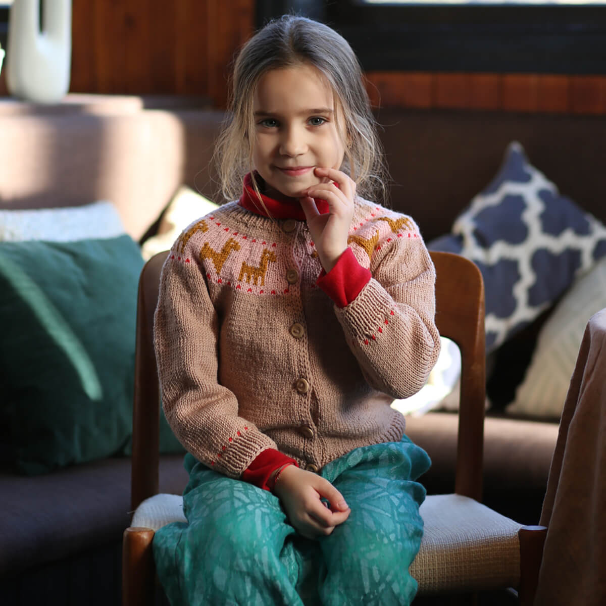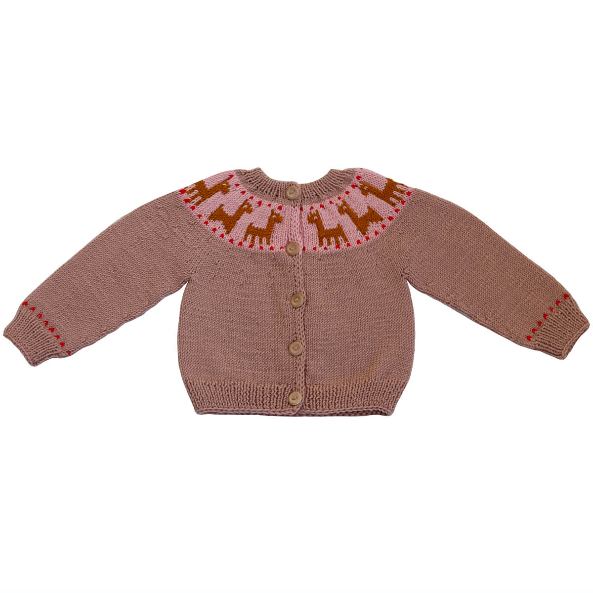 Lama cardigan by Kalinka. Merino Wool cardigan with a llama print across the yoke and wooden button closure.