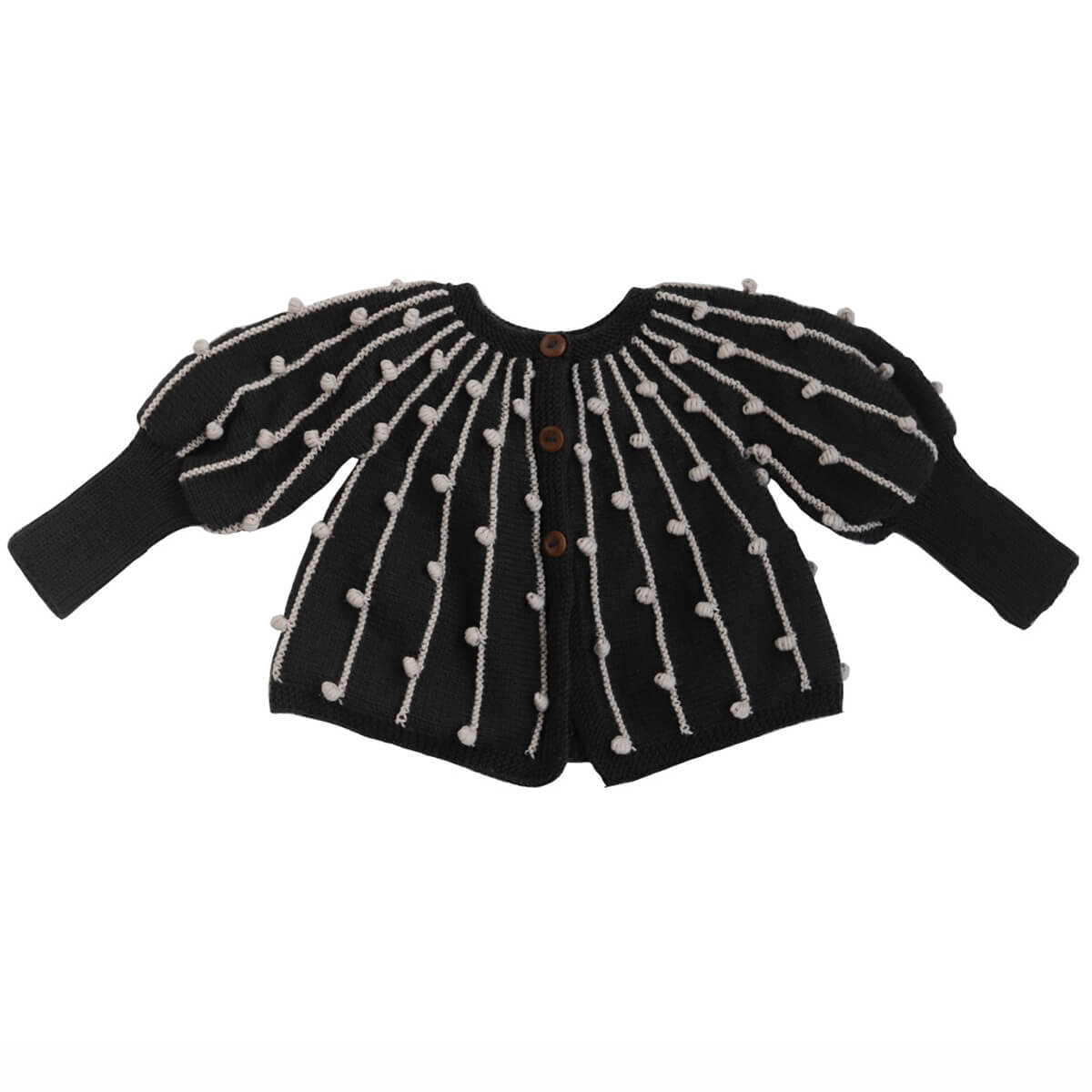 Marion cardigan by Kalinka. One of Kalinka's signature styles, the Marion cardigan has a pretty linear popcorn stitch in a contrasting colour. This heirloom knit is sure to be loved by all.