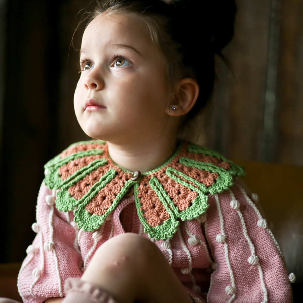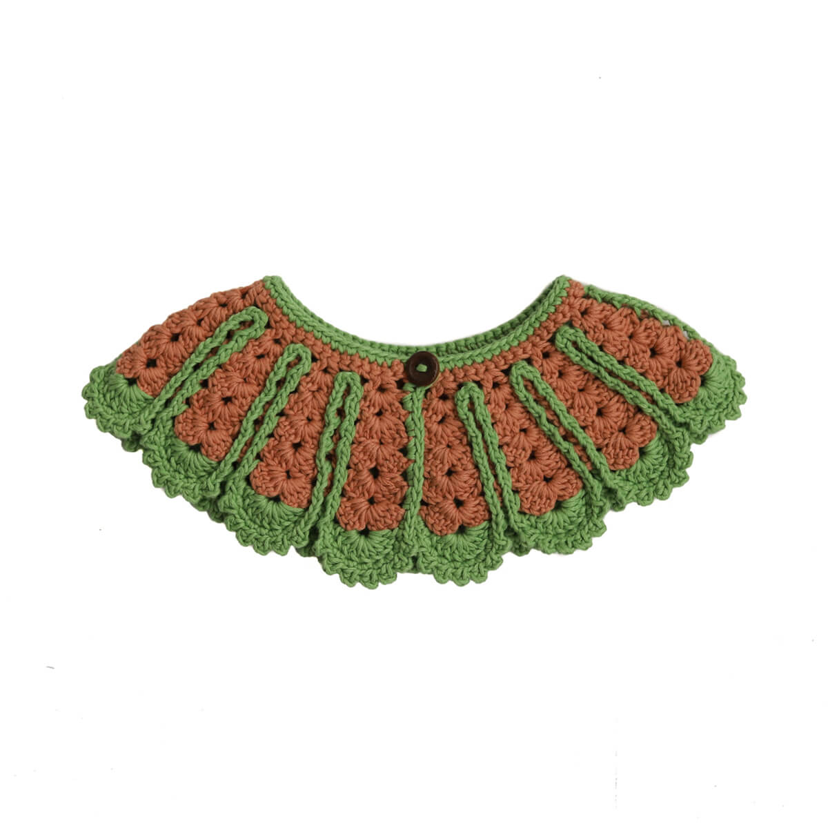 Monica Collar by Kalinka. Soft hand crocheted collar with scallop edge and fastened with a single wooden button. The perfect accessory to elevate your child's outfit.