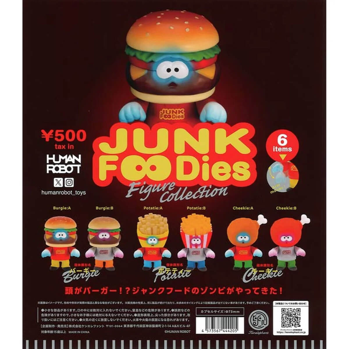 Human Robot Figure Gachapon Capsule Collectible by KenElephant. Highly collectible and authentic Japanese gachapon capsule containing one of six Junk Foodies figures by collectible figure designer and sculptor Human Robot. These unique junk food zombies are a new twist on the popular Pan-Dead series by Human Robot, and include zombie burgers, fries and fried chicken. Perfect for fans of quirky collectibles and inventive designs.