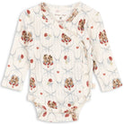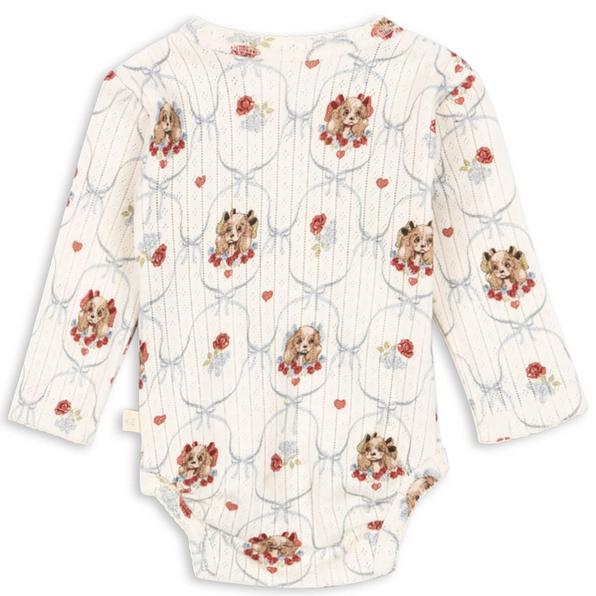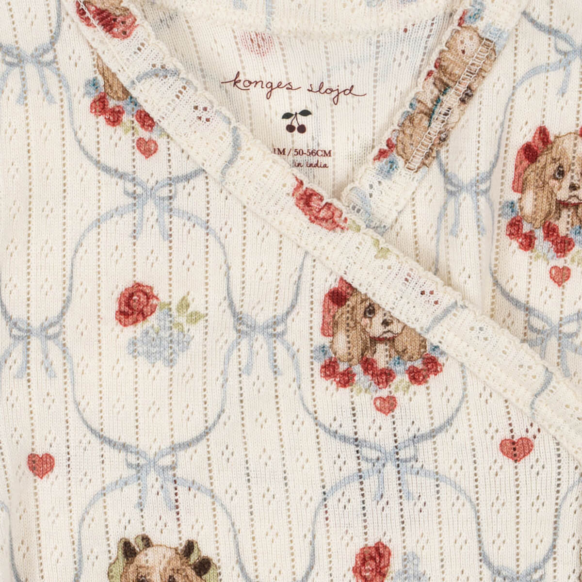 Minnie Newborn Baby Body by Konges Slojd. Soft cotton long sleeve wrap baby body in decorative pointelle with snap closure.