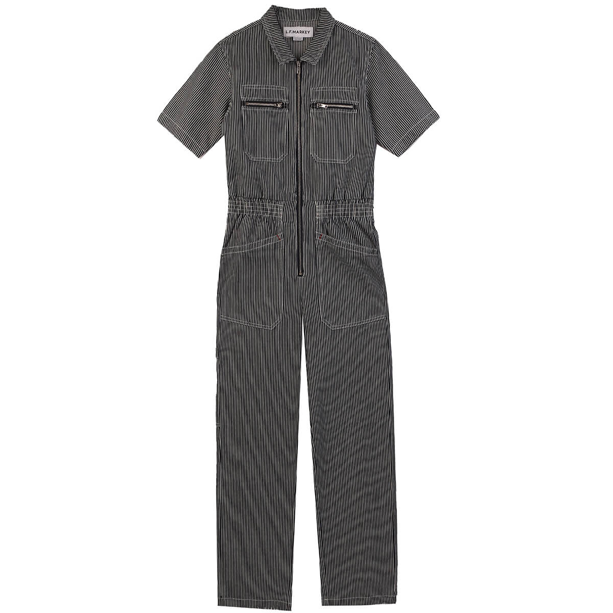 Danny Short Sleeve Boilersuit by L.F.Markey. Our best-selling 70s style boilersuit returns with a seasonal refresh in a premium Indigo railroad stripe. Features contrast white stitching and red bartacks typical of archival workwear. Slim-fitting, straight leg with a front zip and elasticated waist.