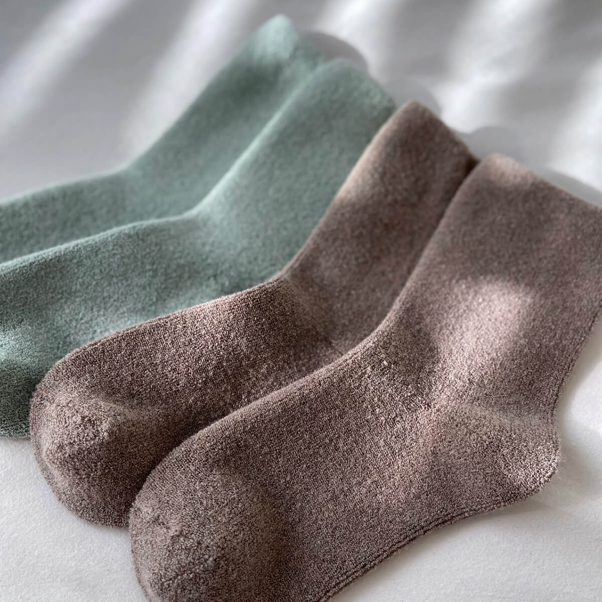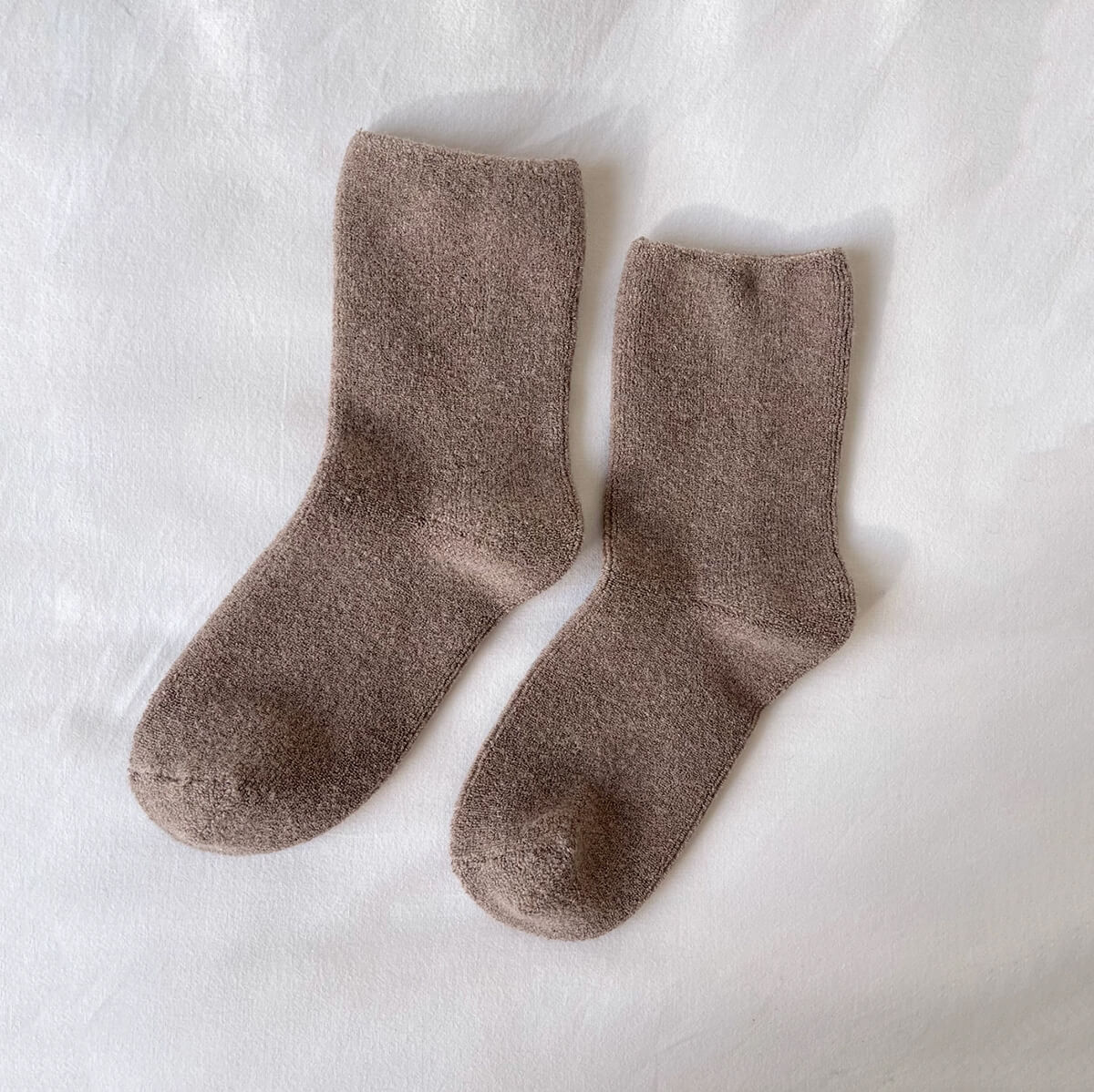 Cloud socks by Le Bon Shoppe. These are hands down the comfiest and cutest socks to wear all year long. Made from a fluffy, terry cotton blend yarn that is breathable and unique. Wear her around the house and feel like you are walking on a cloud. Pair her with your favorite clogs or slides and enjoy the extra cushion.