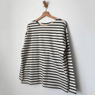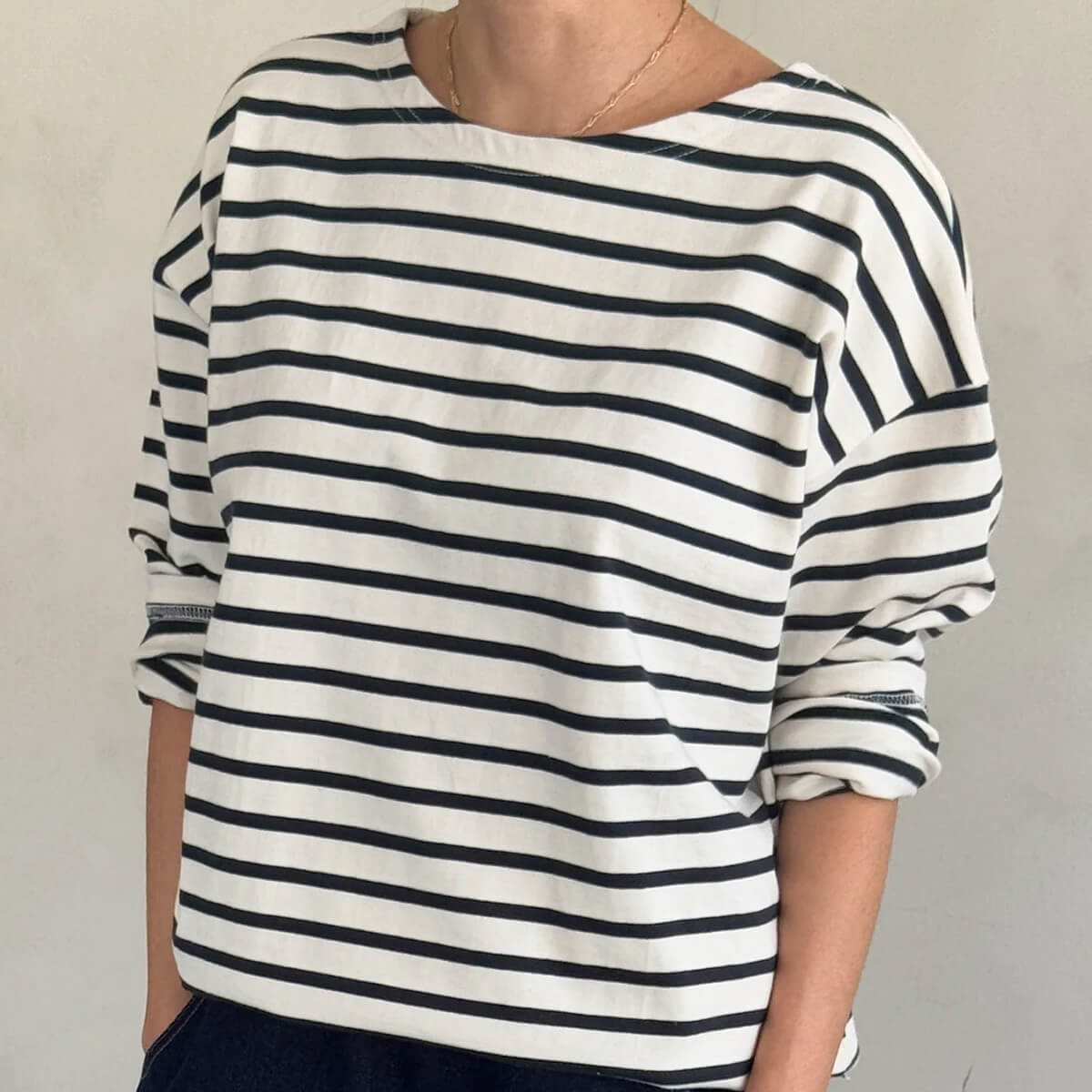 Marseille Boat Neck Top by Le Bon Shoppe. Add a touch of Parisian flair to your wardrobe. The Marseille Top takes inspiration from the timeless Breton stripe uniform, featuring a classic boat neckline and an oversized, full-length fit that gently sweeps the hips. Crafted from durable, heavyweight cotton, it offers structure without sacrificing softness, making it an ideal choice for both elevated and casual looks.