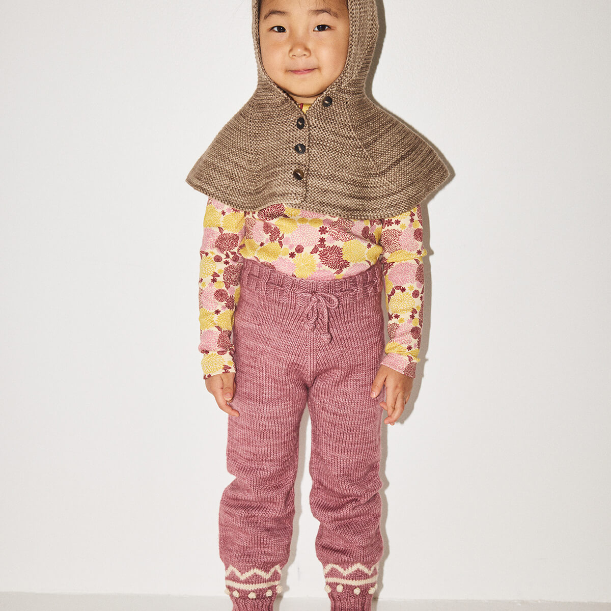 Zig Zag Snowy Day Legging by Misha & Puff. A cozy hand-knit jogger-style legging in Merino wool, featuring hand-worked popcorn stitch details, a zig zag motif, a ribbed waistband with a popcorn-tie drawstring for a secure fit, and ribbed cuffs.