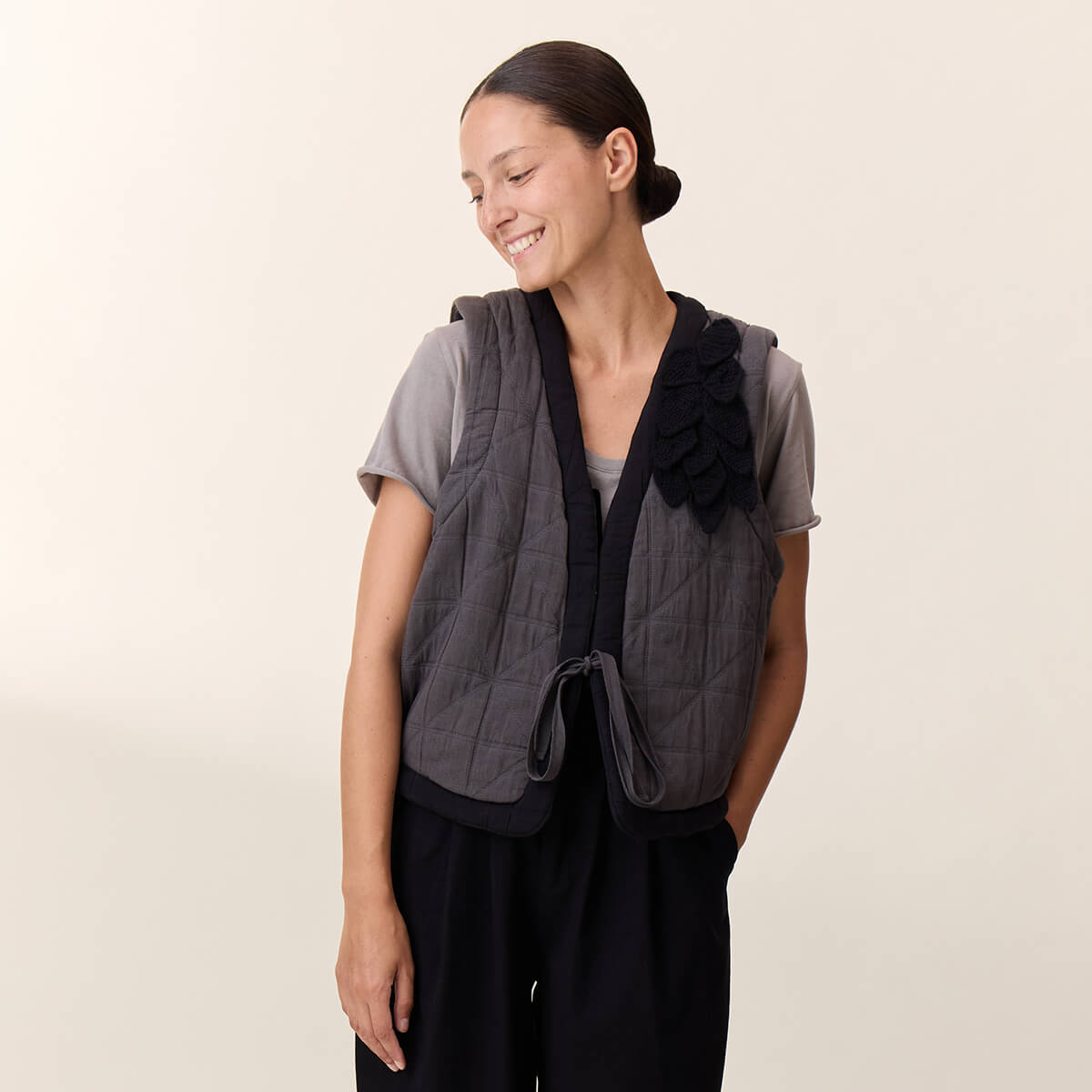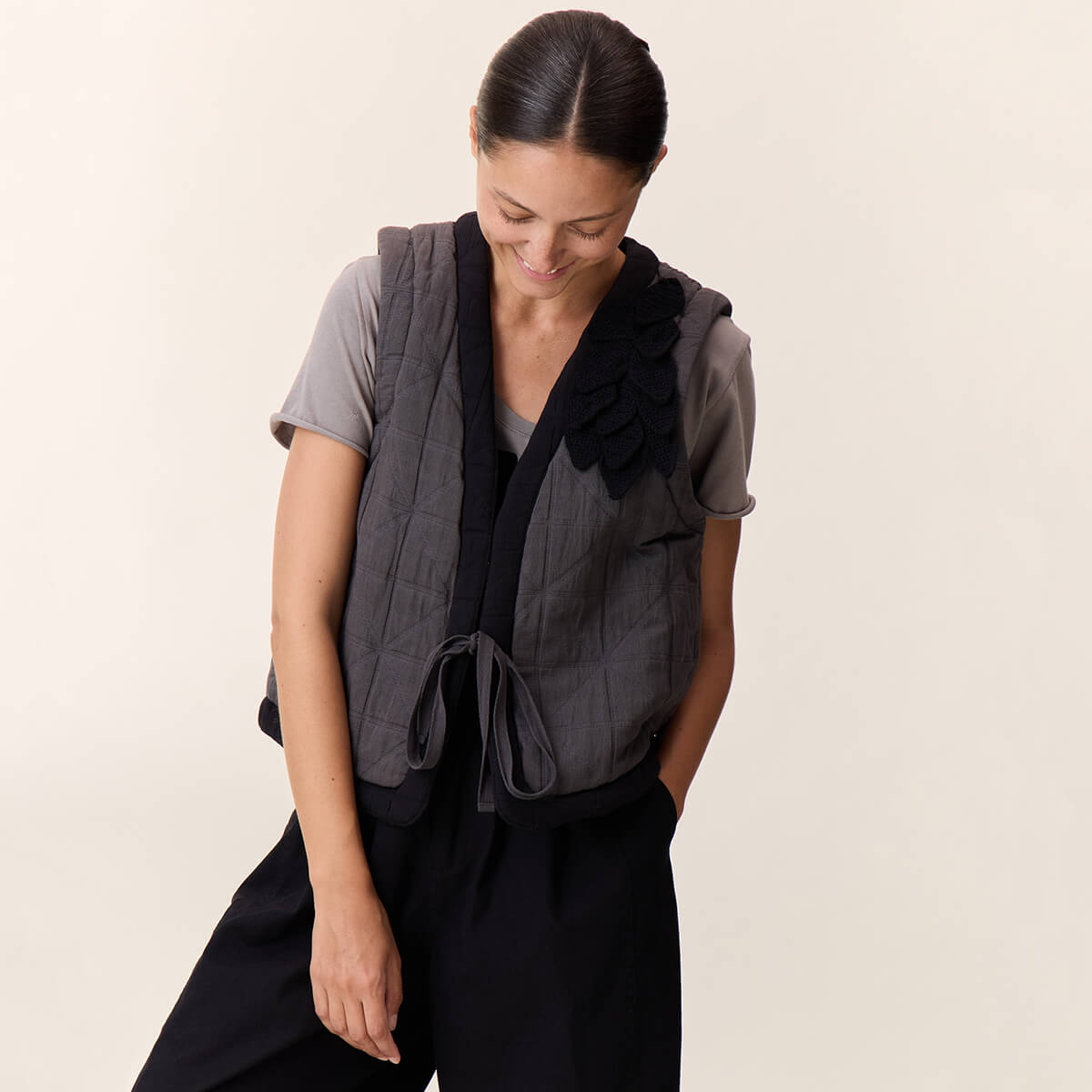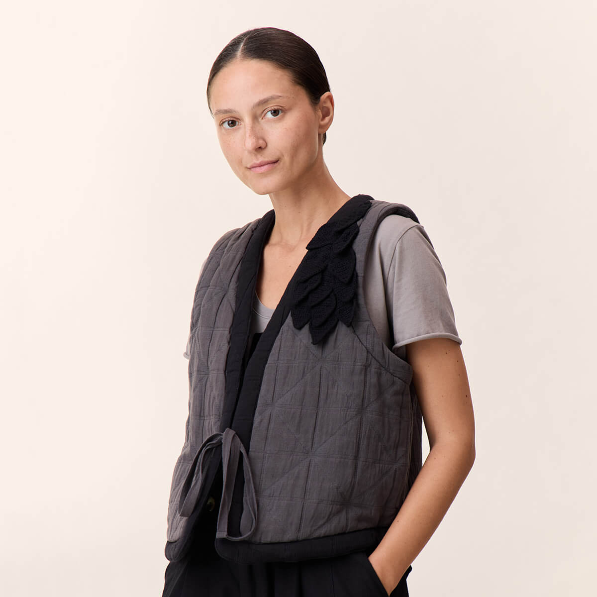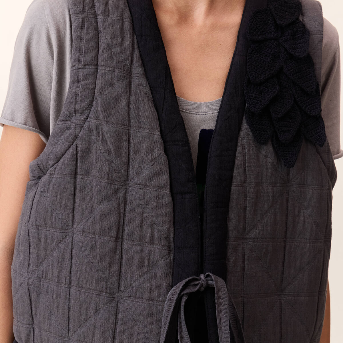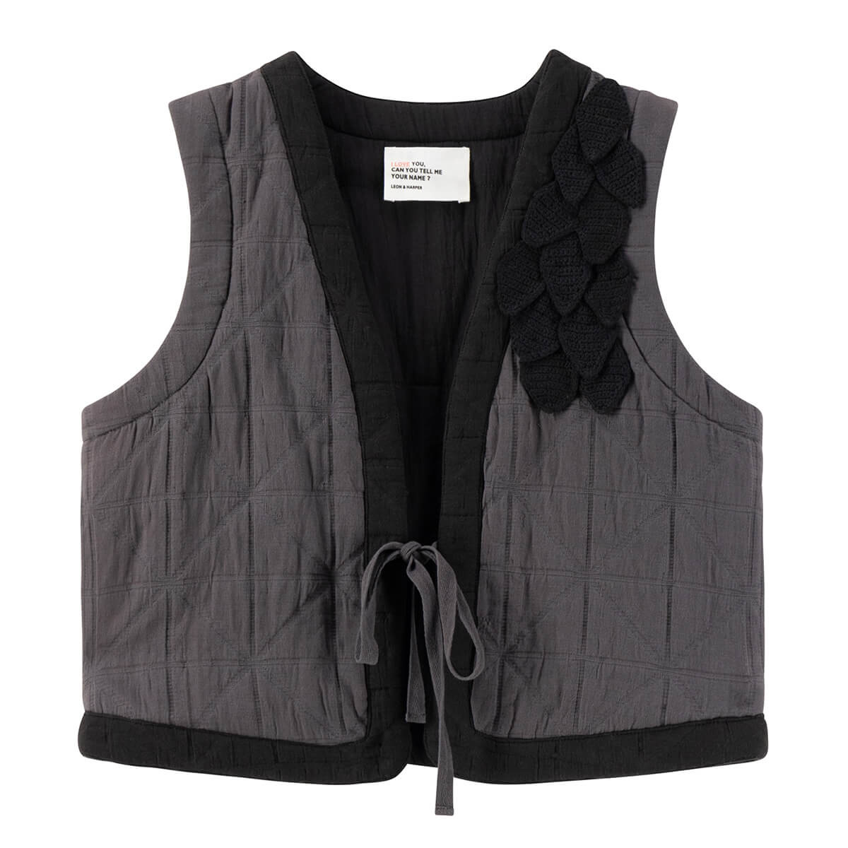 Vent Sleeveless Jacket by Leon & Harper. The Vent vest makes a bold statement with its diamond-quilted texture and contrasting trims that shape the silhouette. The raised appliqué detail on the front introduces a graphic note emblematic of the Leon & Harper spirit. Its relaxed fit, combined with a V-neck opening and ties to fasten, favors layering and freedom of movement.