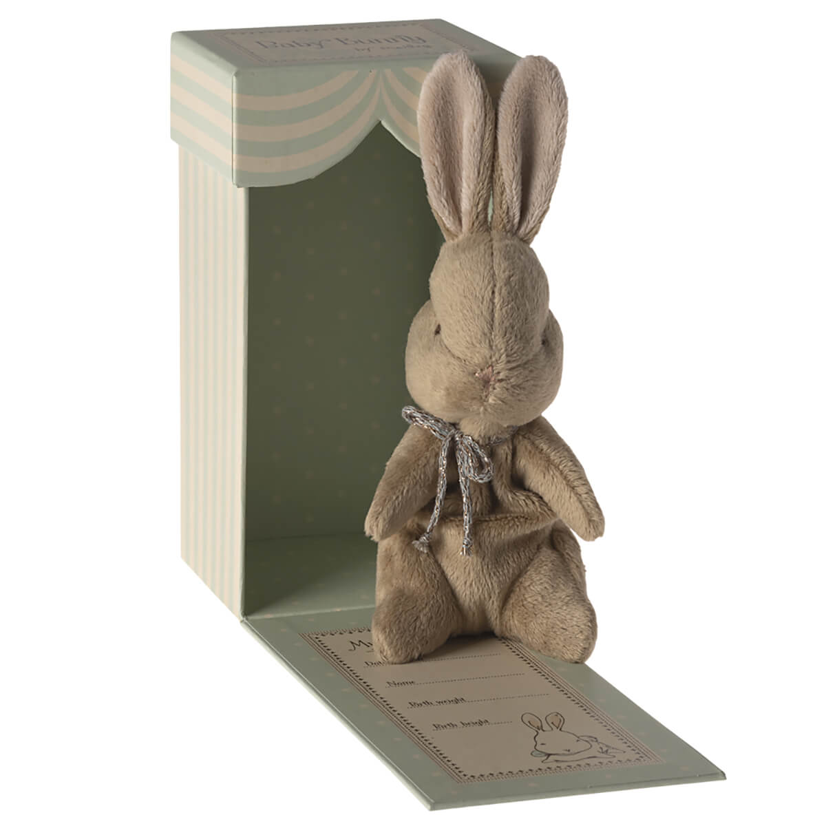 My first bunny in a box by Maileg. My first bunny is perfect for small hands. It is made in a soft plush quality and has a coloured ribbon around the neck. It comes in a beautiful gift box, inside you can add the birth information.