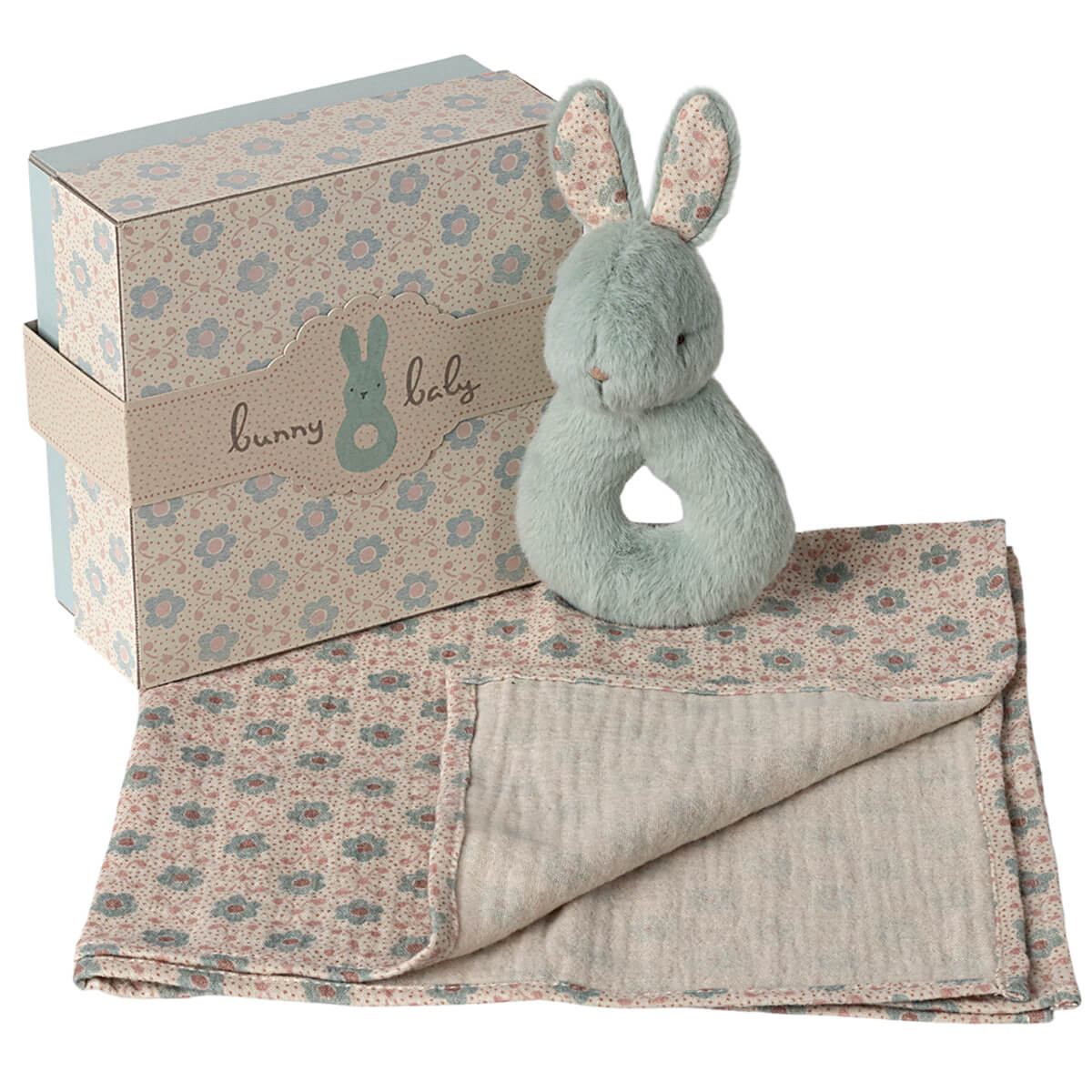 Rabbit Rattle Set by Maileg. A perfect gift for new babies. The set includes a soft cotton cuddle cloth and a small bunny rattle. The rabbit has a small rattle inside that makes a soft sound. Presented in a beautiful gift box.
