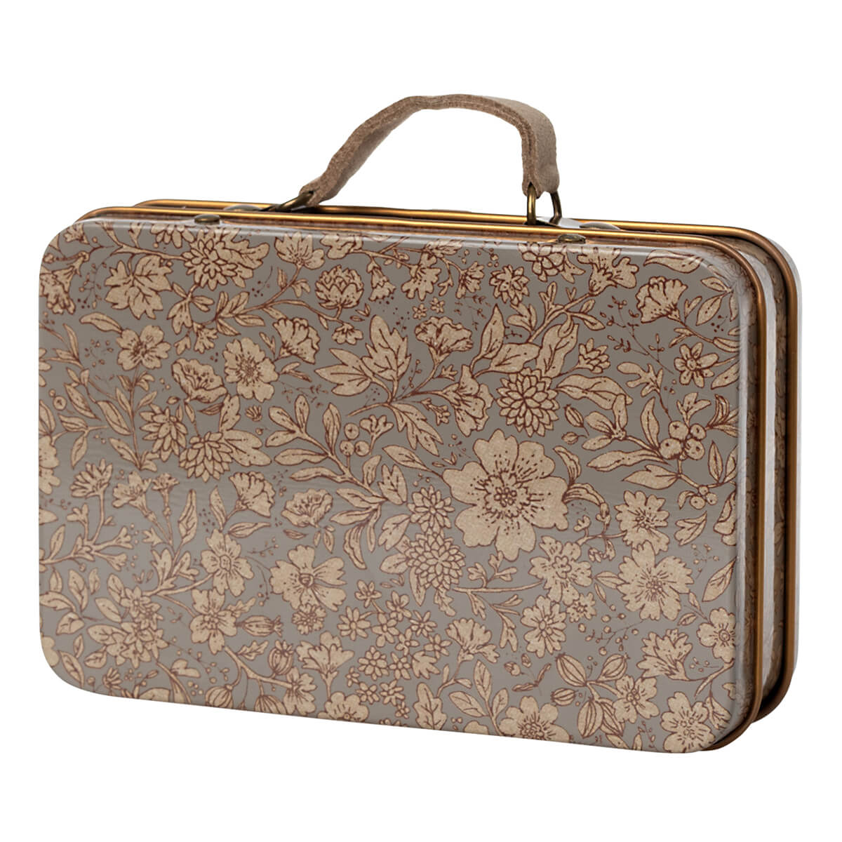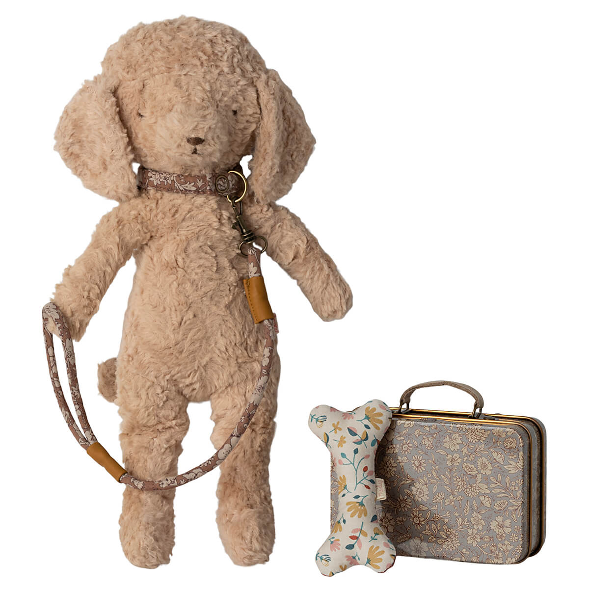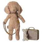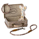 Puppy accessories set by Maileg. This set is all you need for your soft plush dog. The set includes a bone, collar and leash packed nicely in a metal suitcase with a beautiful Maileg print.