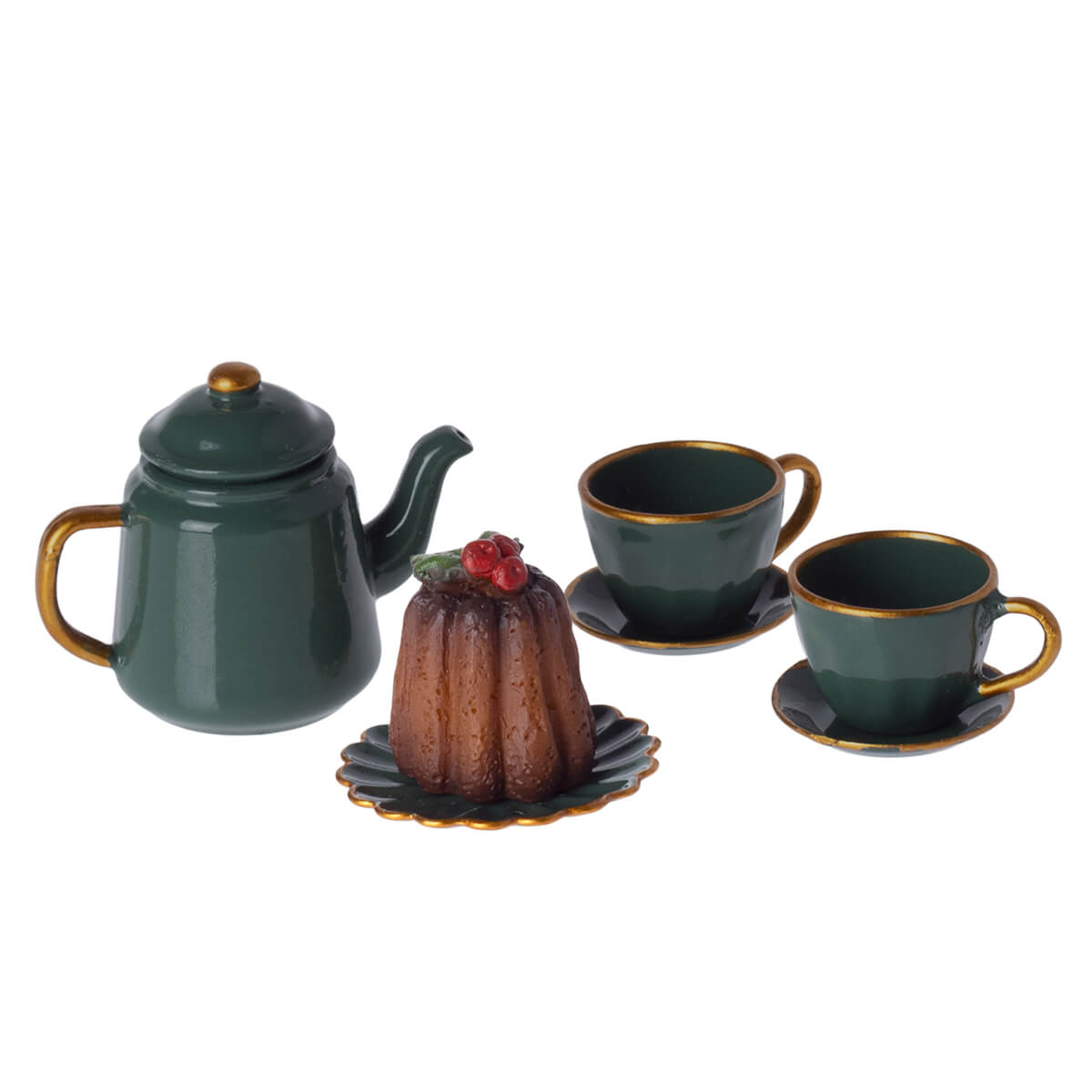 Christmas Tea Party by Maileg. Decorate a cosy Christmas tea table with this lovely set. It is perfect in size for the mouse family. In the beautiful giftbox you find a metal tea pot, two cups, a plate and a deliciously decorated cake made in polyresin.