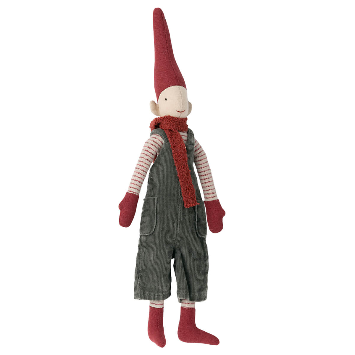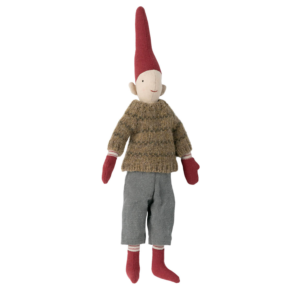 Mini Pixy by Maileg. A collection of four individual pixies. All dressed up in cozy Christmas clothes. They all have magnets in their hands and in left foot so they can climb and decorate everywhere.