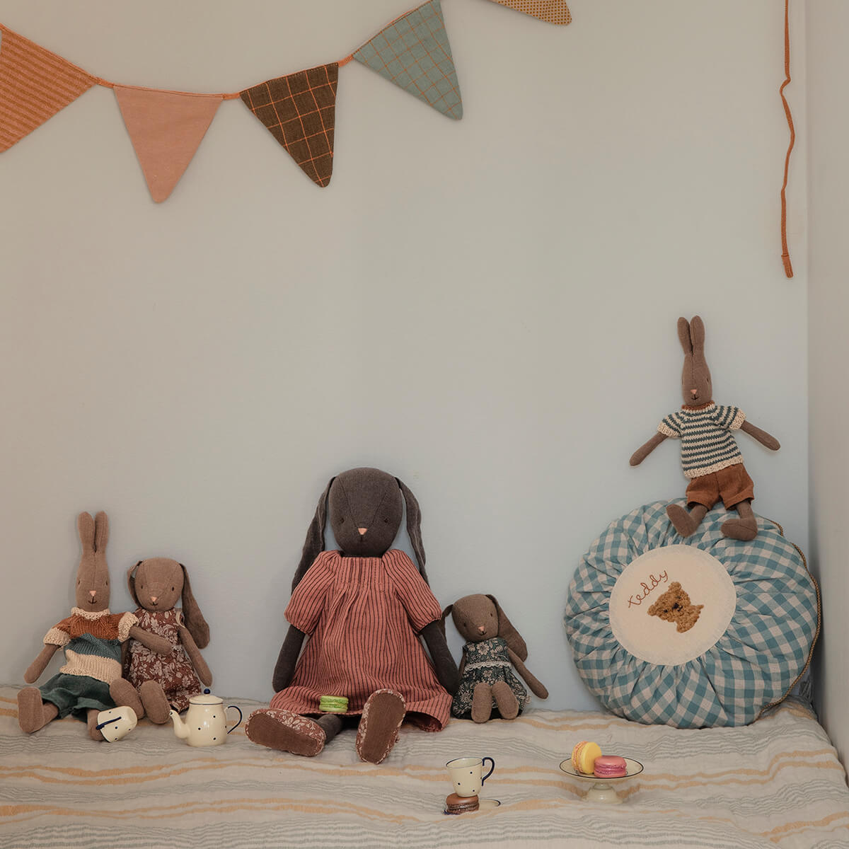 Brown Bunny by Maileg. A classic bunny made of soft natural linen fabric that gives a lovely hand feel and look. Size 1 bunny fit into the Maileg dollhouse and all furniture size Mini and Miniature.