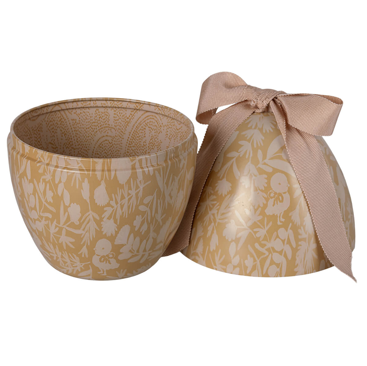 Metal Easter egg by Maileg. The Maileg easter egg has a beautiful new all over print. Take a good look at the print and see if you can find the different animals. The egg comes with a big soft bow on the top that gives the egg an exclusive look.