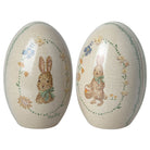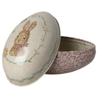 Easter egg metal tins by Maileg. A set of two metal Easter eggs. The decoration on the eggs is Dorthe Mailil's personal embroidery which was made into a beautiful print on the eggs. Can be filled with small gifts including chocolates, and complies with the food certificate standard.