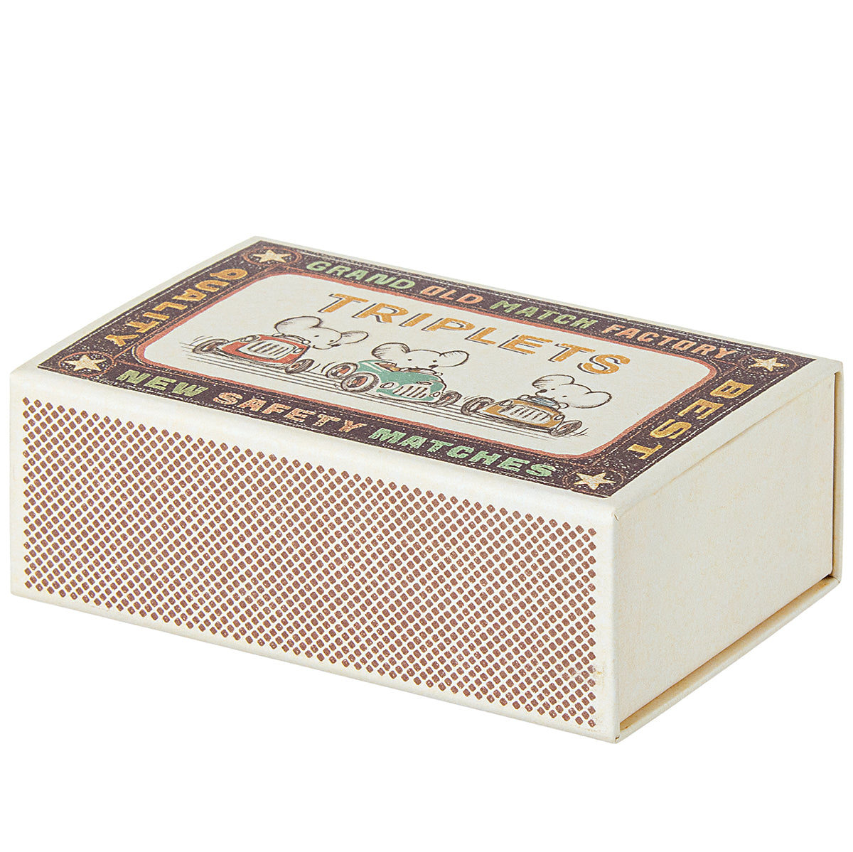 Baby Mice Triplets In Matchbox by Maileg. A classic Maileg item. Now you can have three baby mice at the same time. Tuck the triplet baby mice carefully in their matchbox bed in the warm sleeping bag where they sleep tight side by side. These mice fit all accessories in size baby mouse.