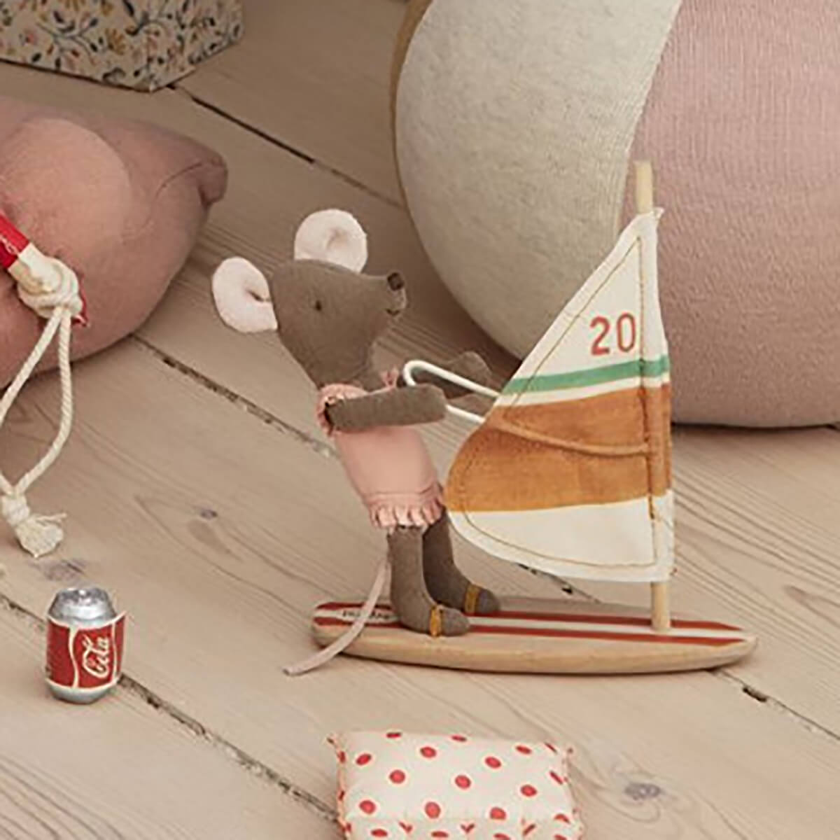 Beach Mice Surfer Little Sister by Maileg. It's vacation time! This mouse is ready for a day at the beach. She is wearing a swimsuit and brings her surfboard as she prefers to use the time on the sea. The surfboard and mast are made of wood.